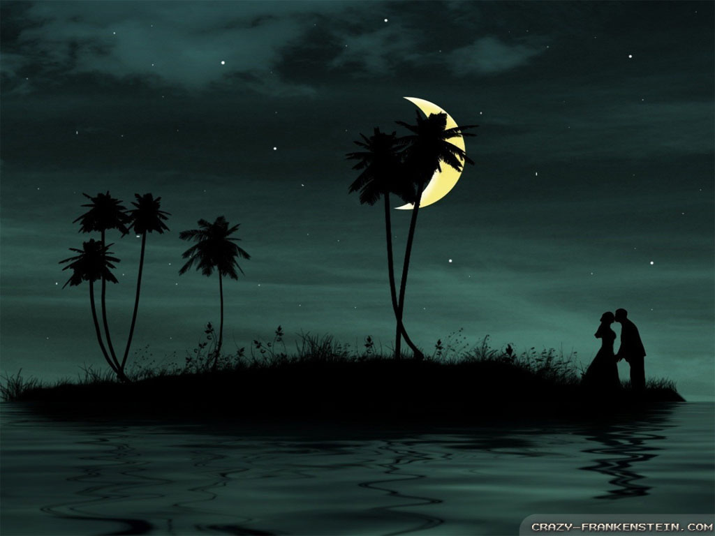 Description: A couple kissing under a full moon in the night sky over a tropical island with palm trees and a full moon.