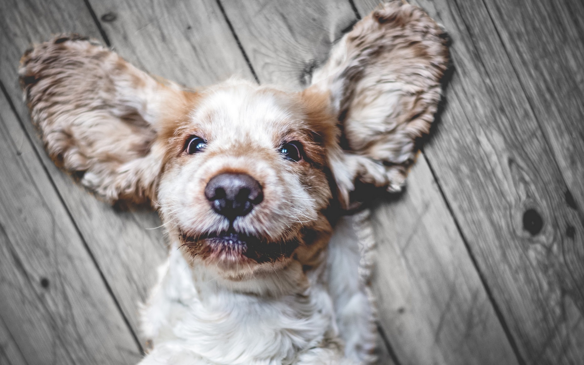 Description: A dog with a funny look on its face sitting on a wooden floor with his ears up and his eyes closed.