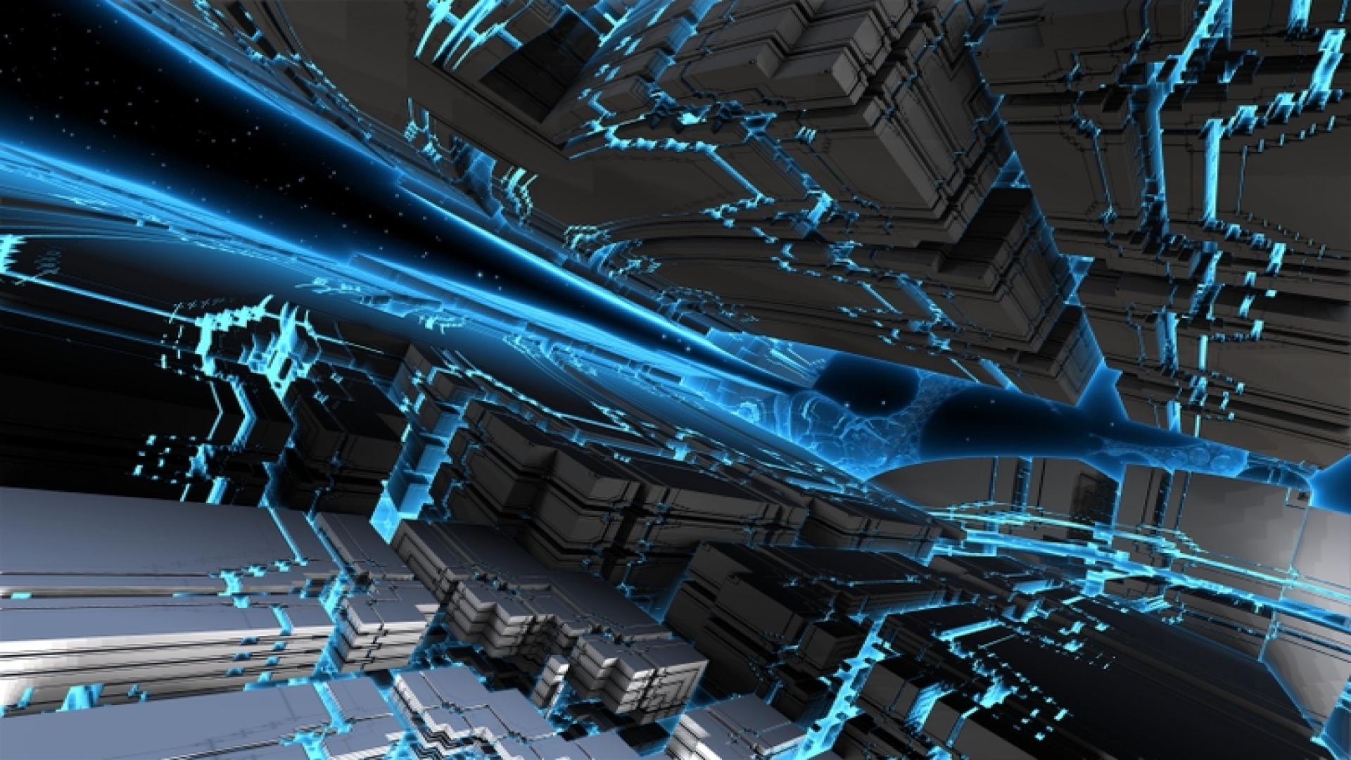 Description: A futuristic abstract background with blue lines and squares and a black background with white dots and lines and a blue line.