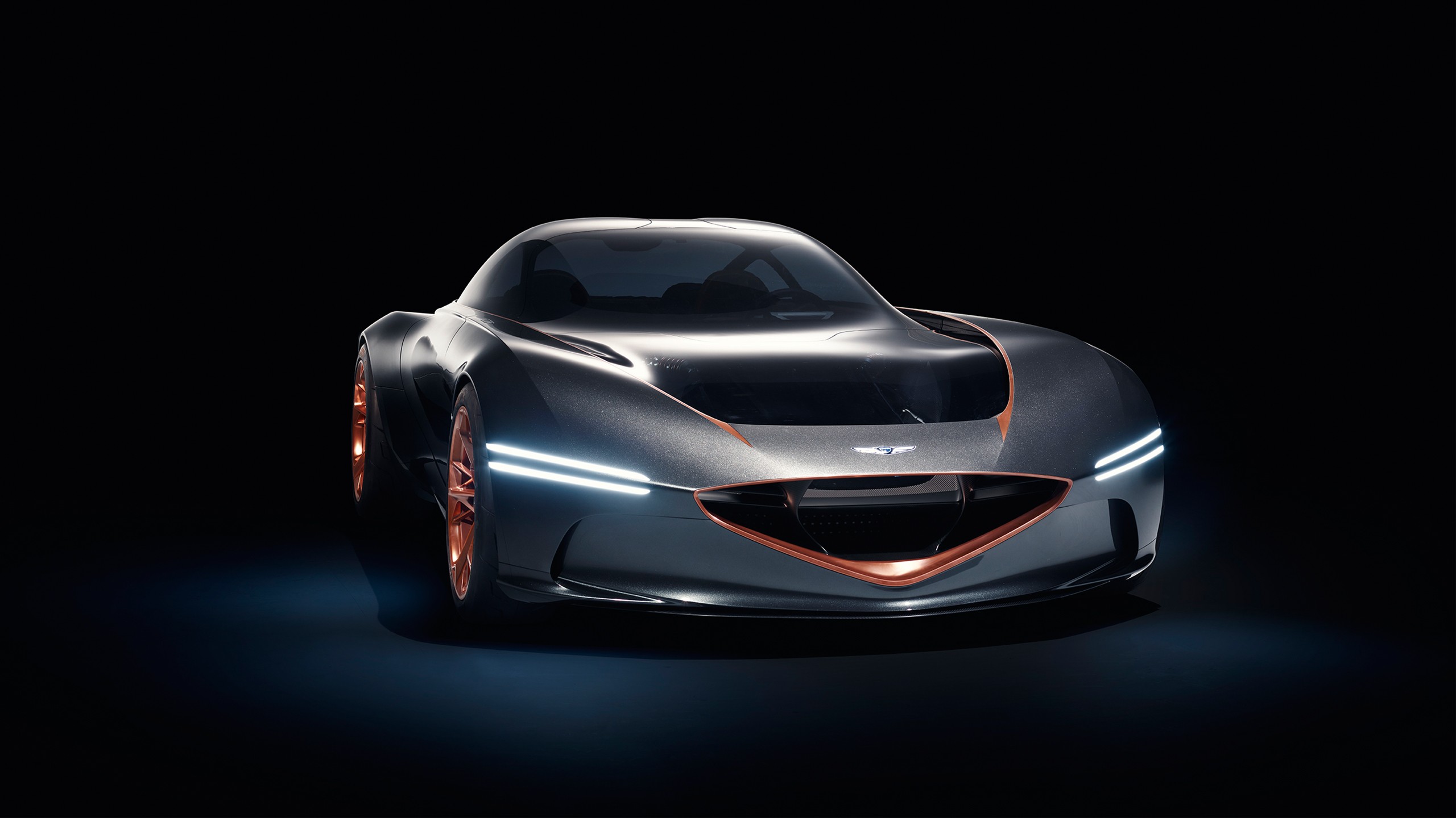 Description: A futuristic car is shown in the dark with its lights on and a black background with a white stripe.