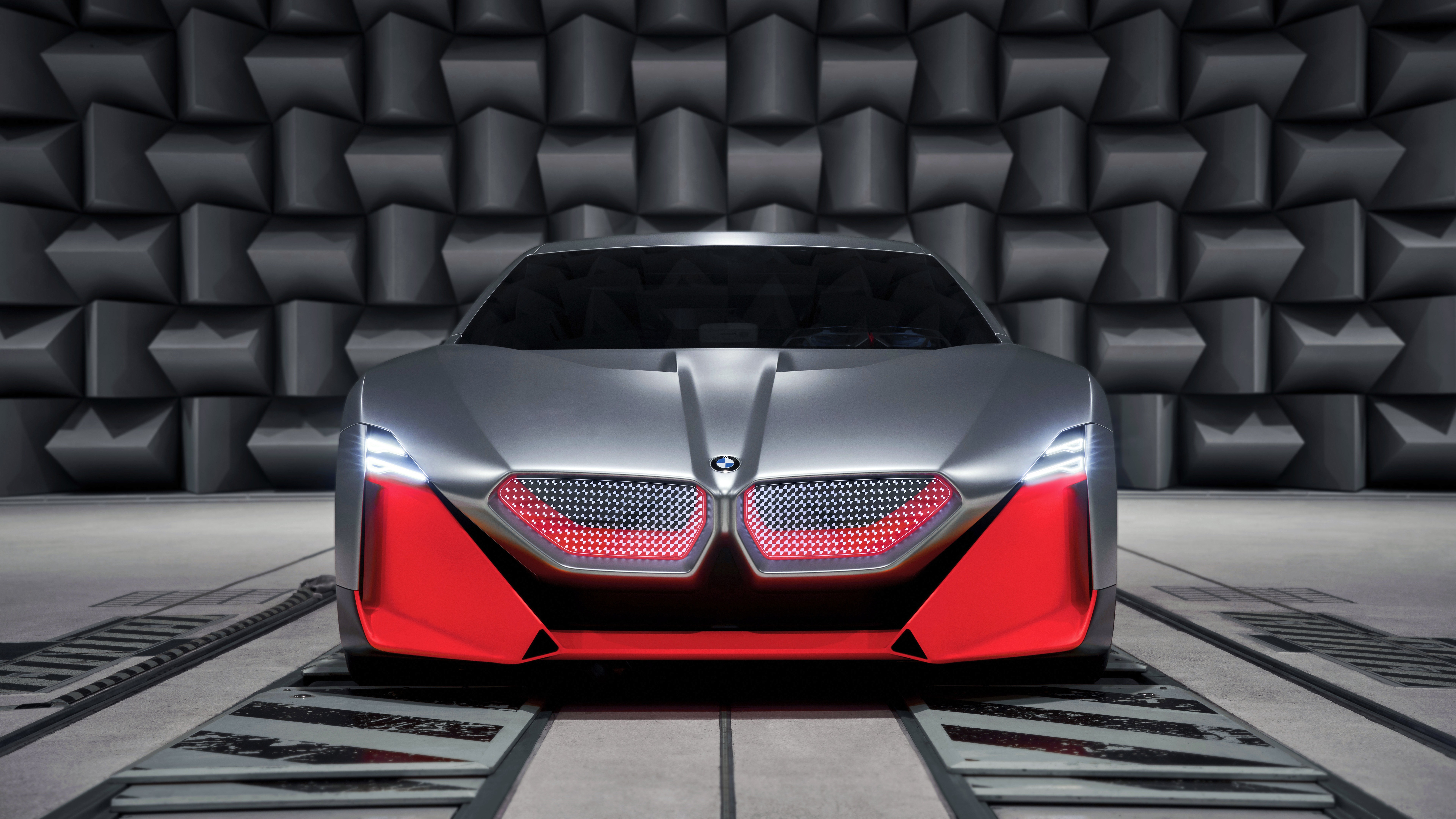 Description: A futuristic car is shown in a dark room with a wall of grey blocks behind it and a red light on the front.