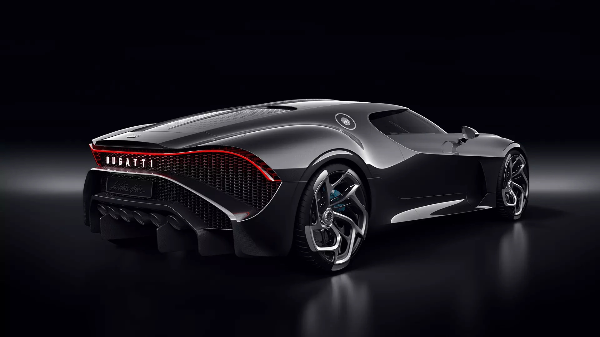 Description: A futuristic car is shown in a dark room with a black background and a red light on the side.