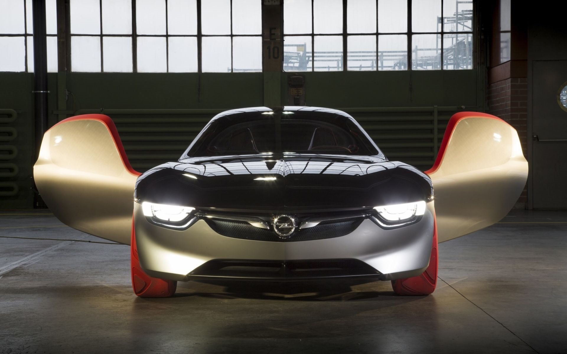 Description: A futuristic car is shown in a garage with a clock on the wall behind it and a large window.