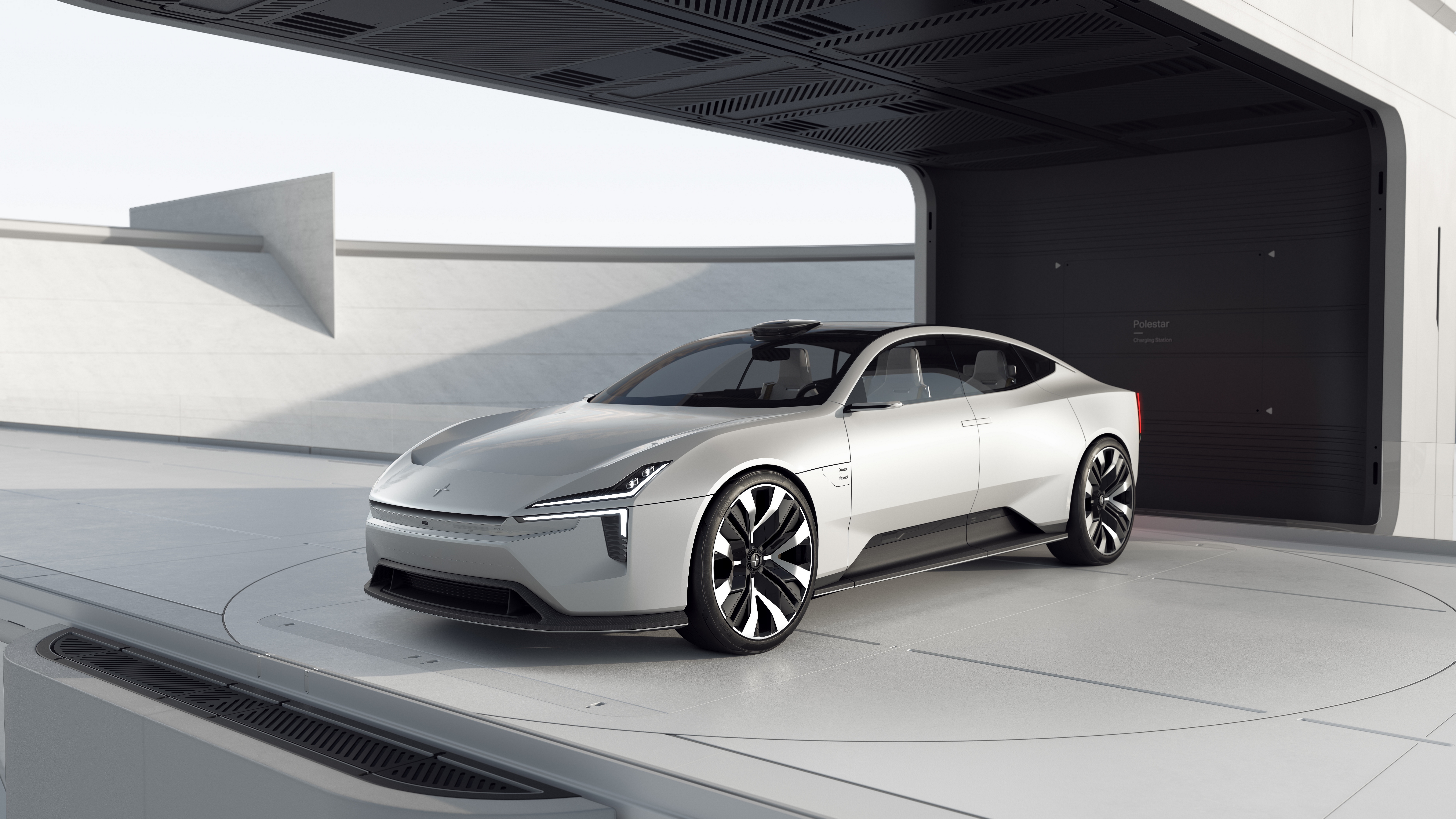 Description: A futuristic car parked in a garage with a door open to reveal it's new design and features.
