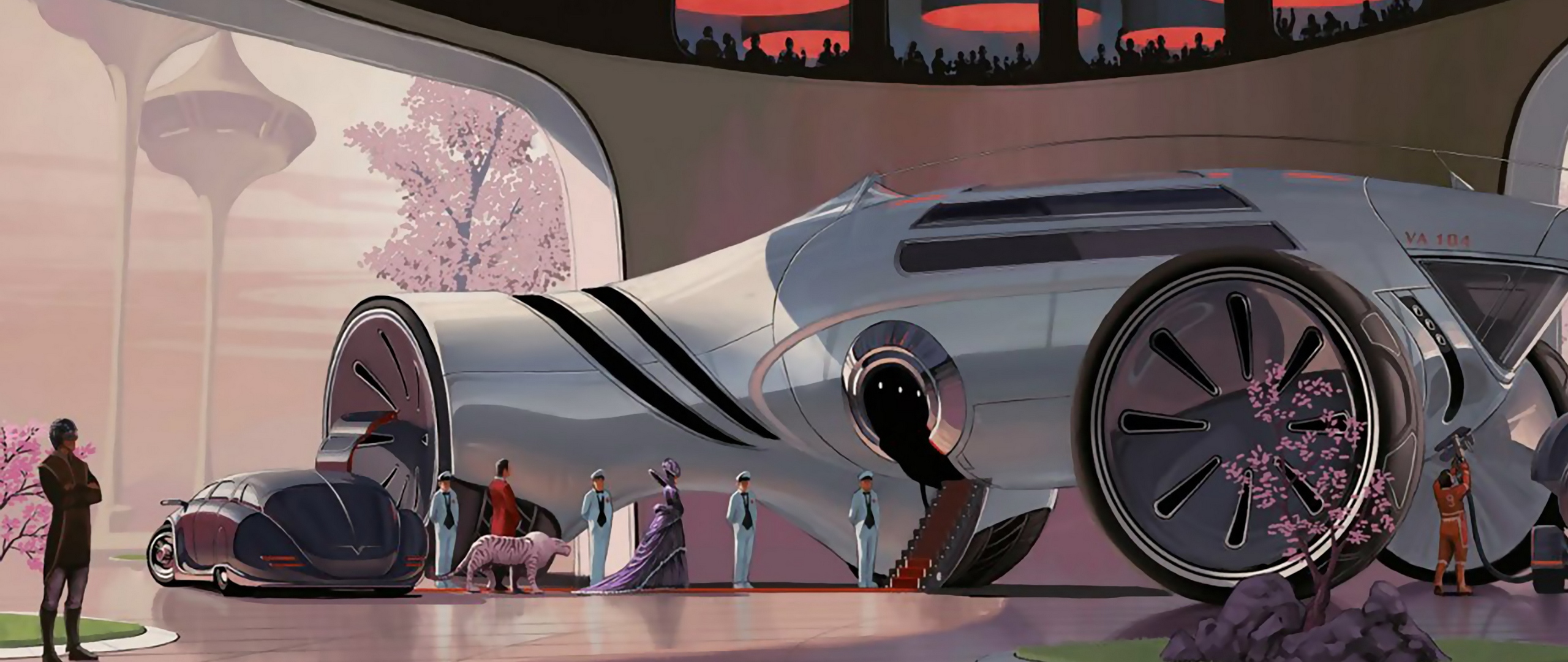 Description: A futuristic car is parked in a garage with people standing around it and a man standing next to it.