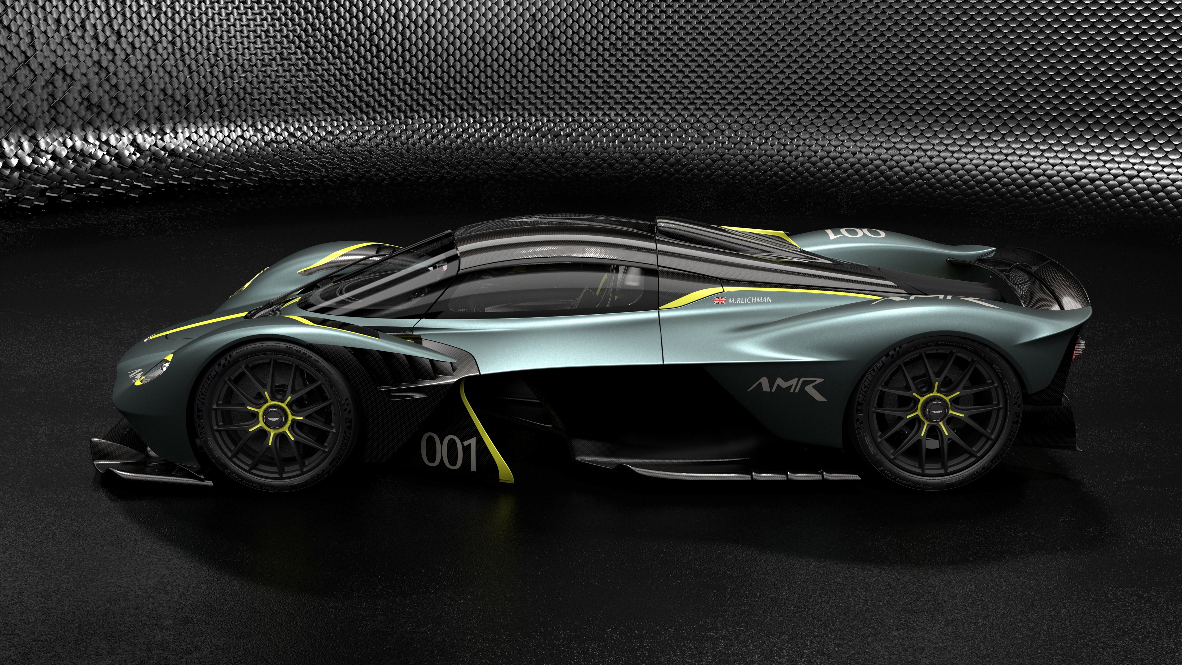 Description: A car is shown in a dark room with a metallic background and a yellow stripe on the side of the car.
