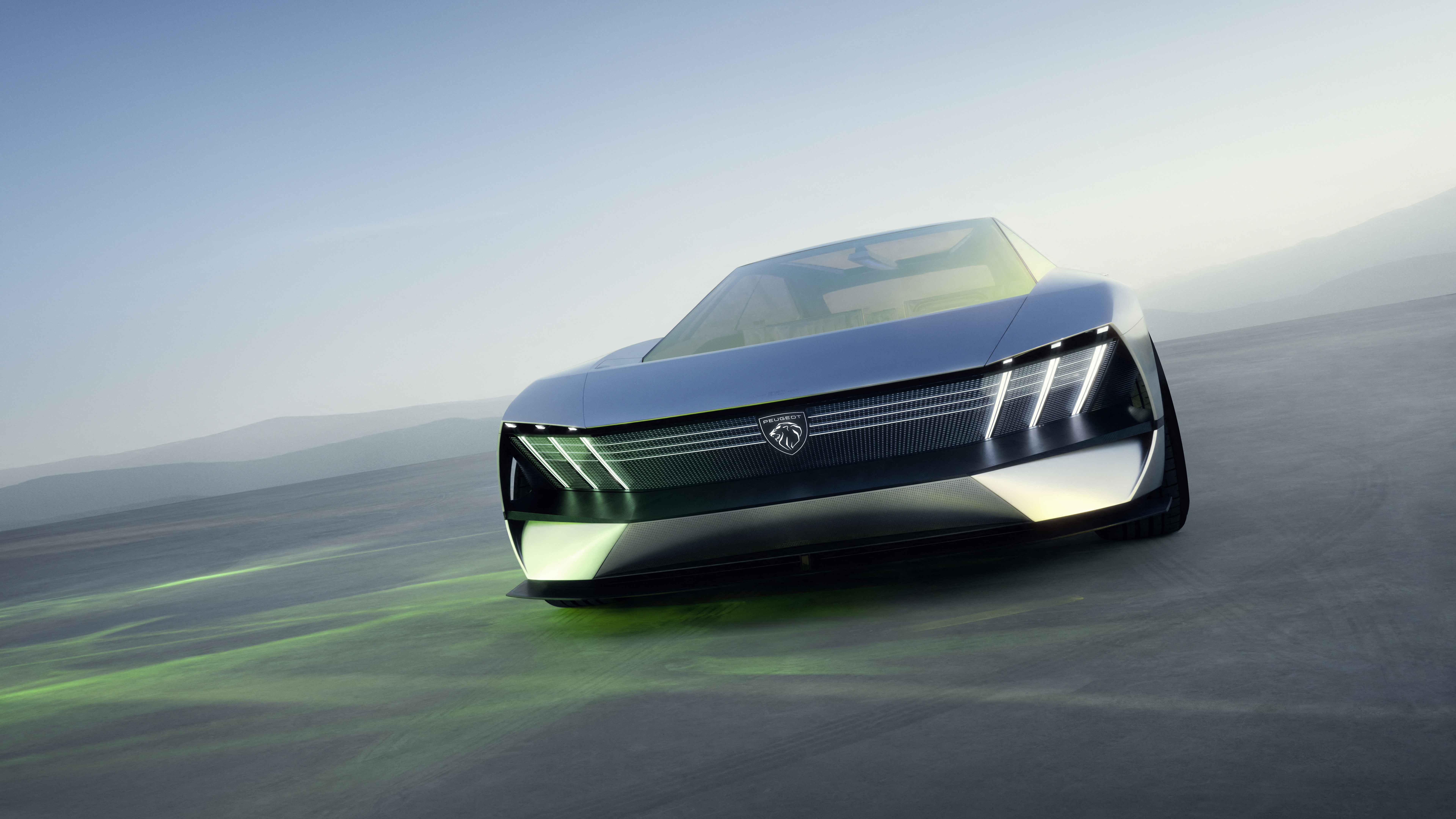 Description: A futuristic car driving on a road with mountains in the background and a blue sky in the background with a few clouds.