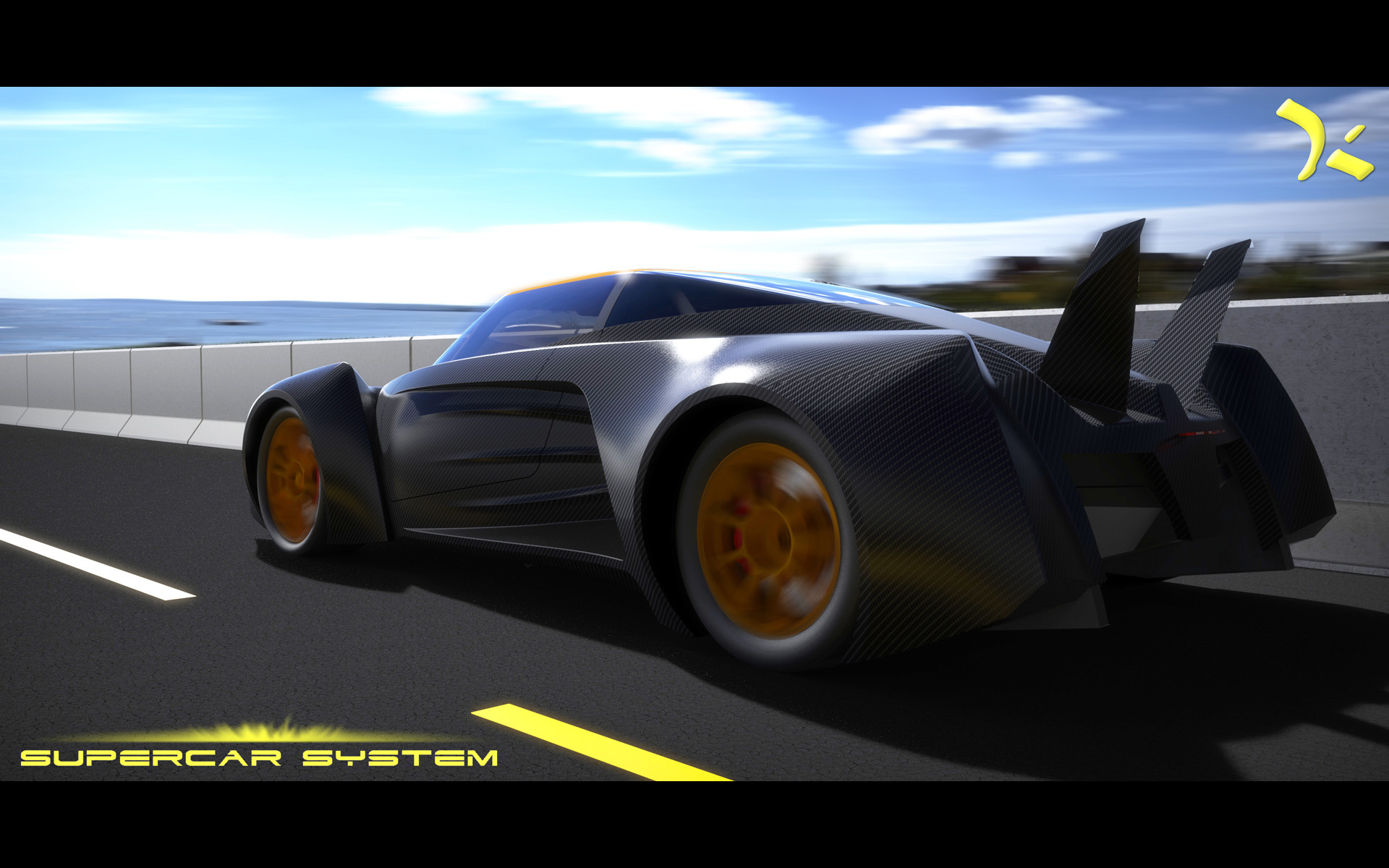 Description: A futuristic car driving down a road next to the ocean and a yellow arrow pointing to the right of the car.