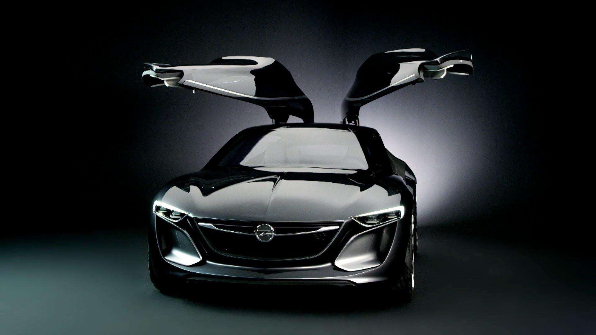Description: A futuristic car with its doors open in the dark room with a black background and a black background with a white light.