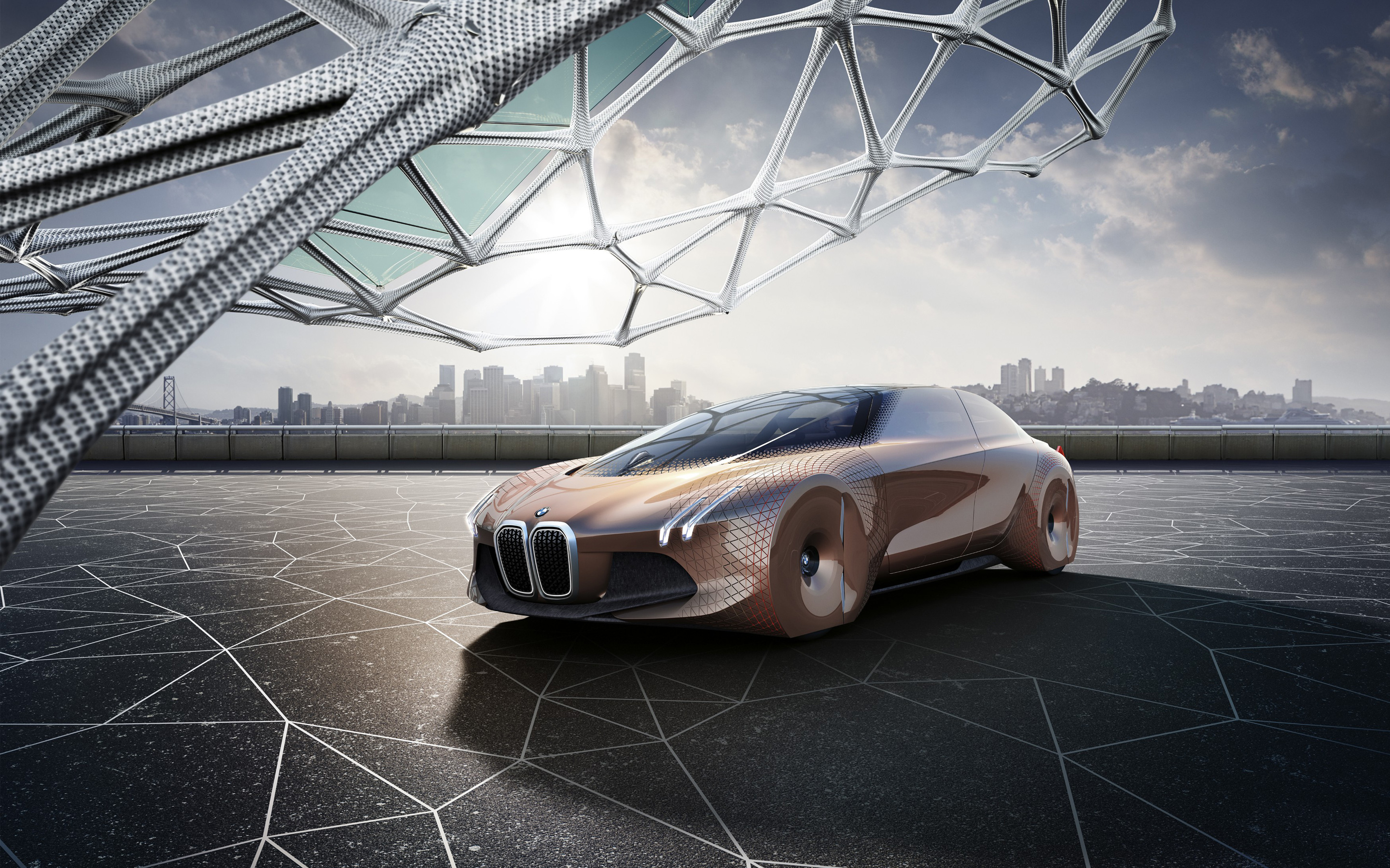 Description: A futuristic car is parked in a parking lot with a city in the background and a bridge in the foreground.