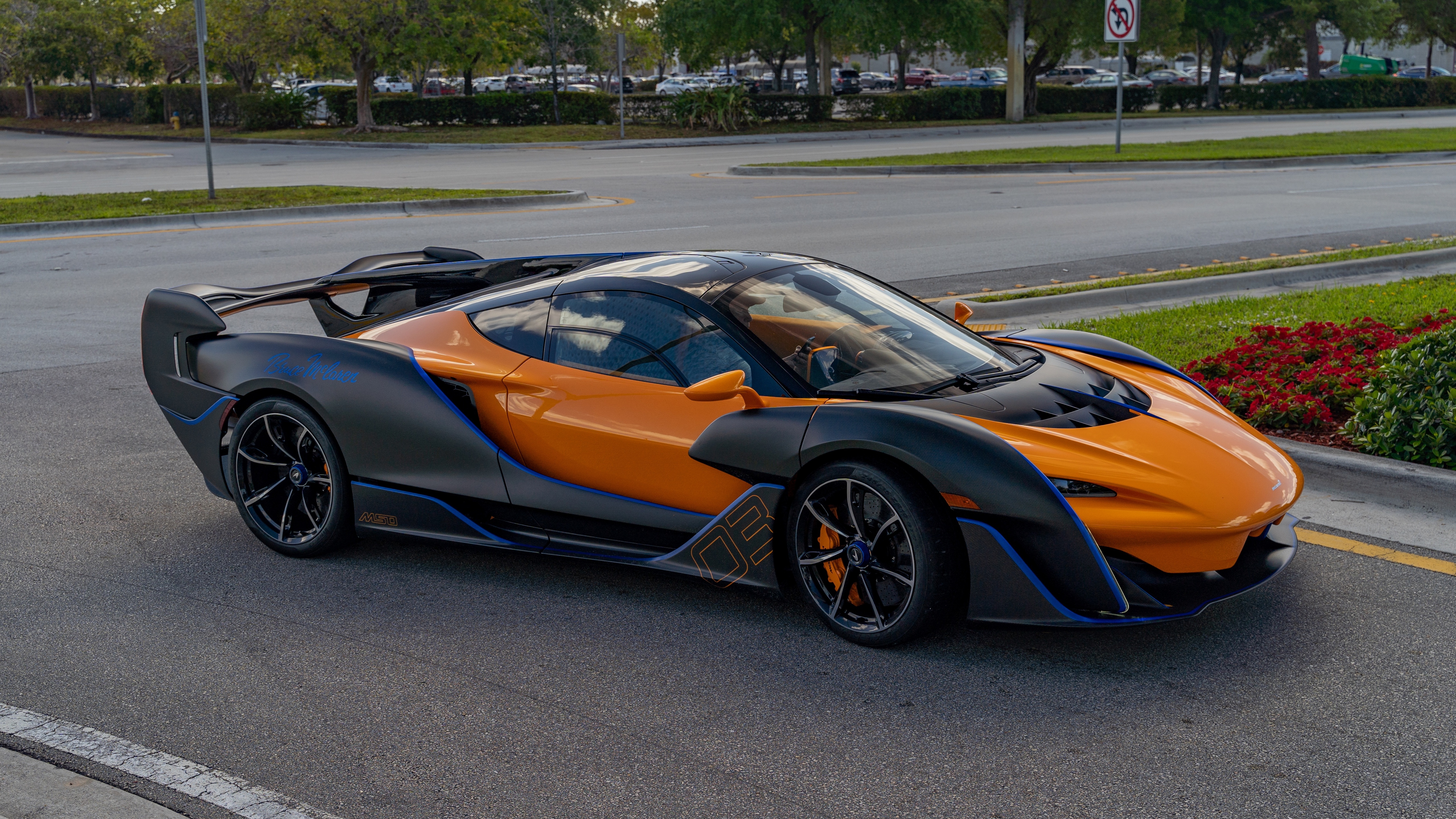 Description: A very nice looking car on a street by some bushes and trees and a street sign in the background.