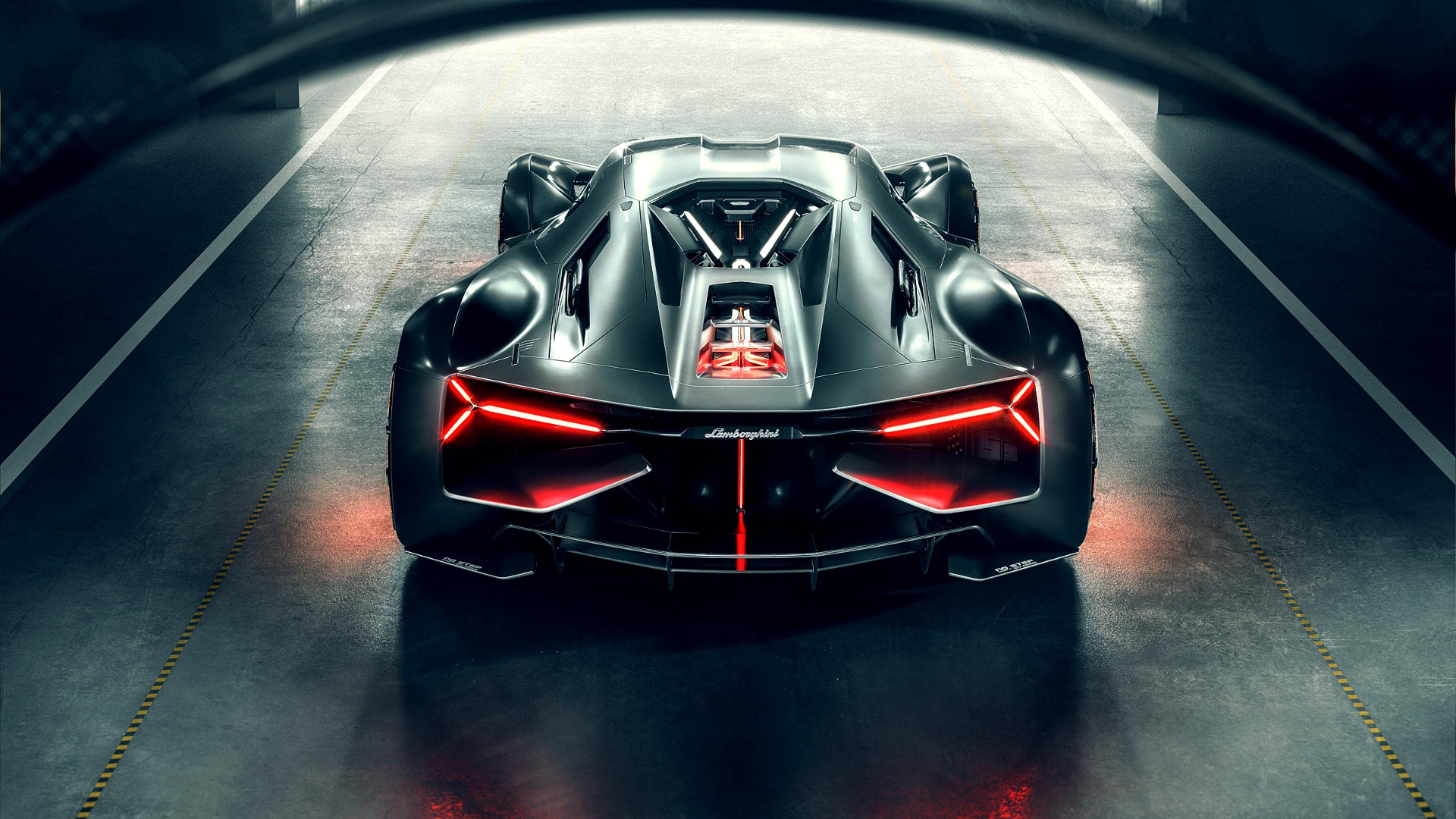 Description: A futuristic car is shown in a tunnel with red lights on it's side and a black body.