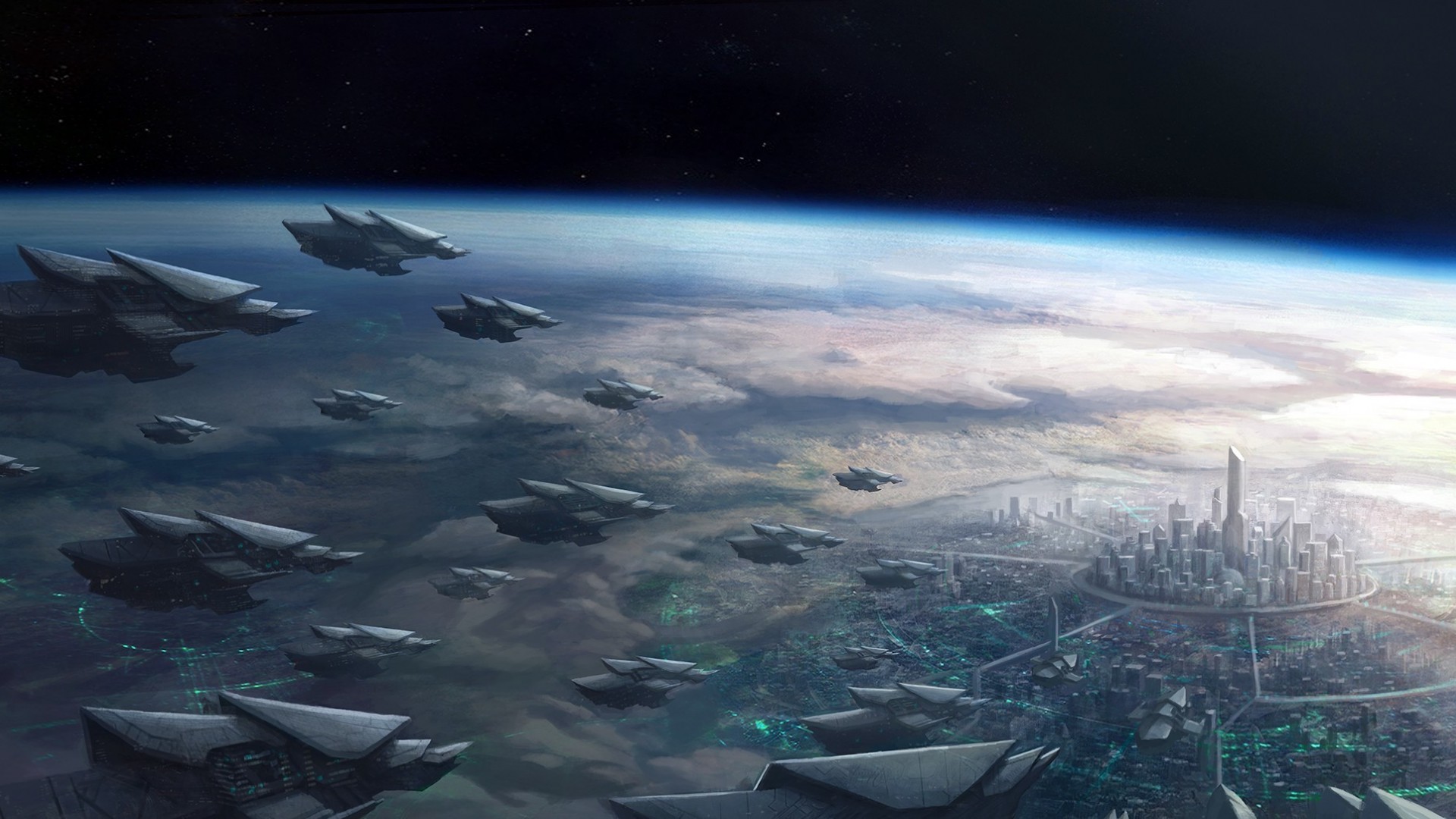 Description: A futuristic city surrounded by a massive group of fighter jets in the sky above a planet with a city and a large moon.