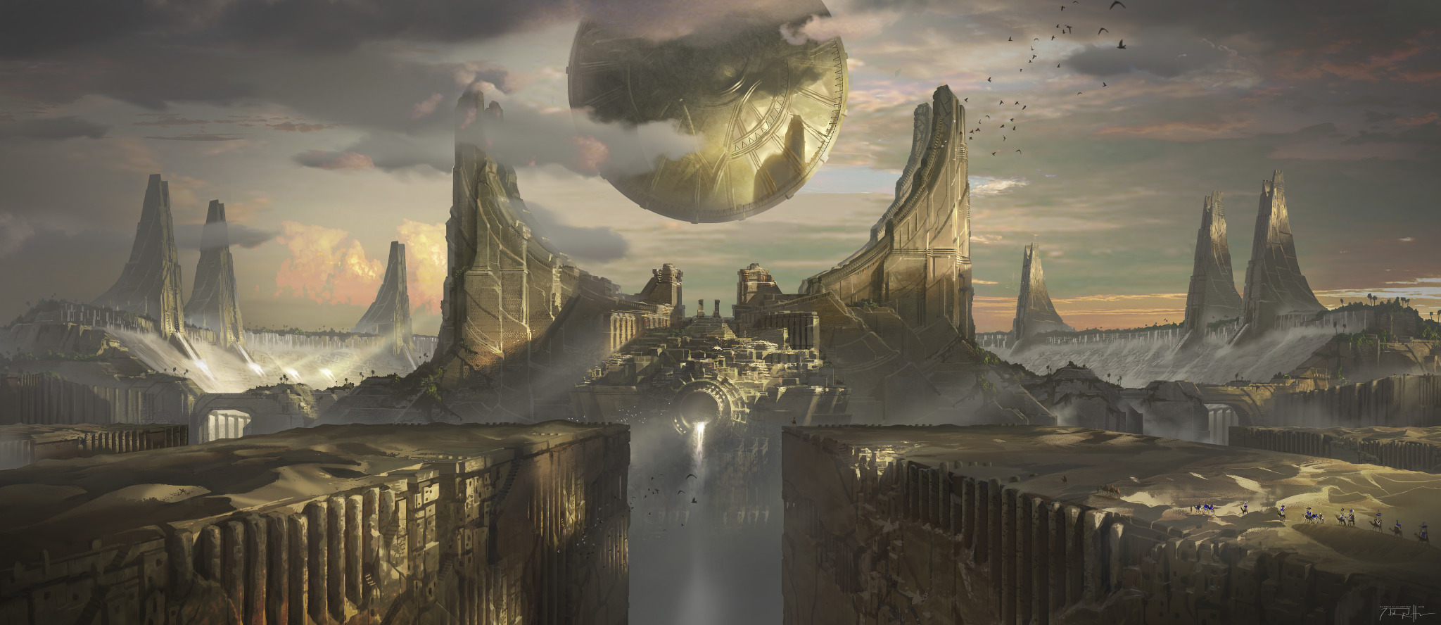 Description: A futuristic city with a giant head in the middle of it's landscape.