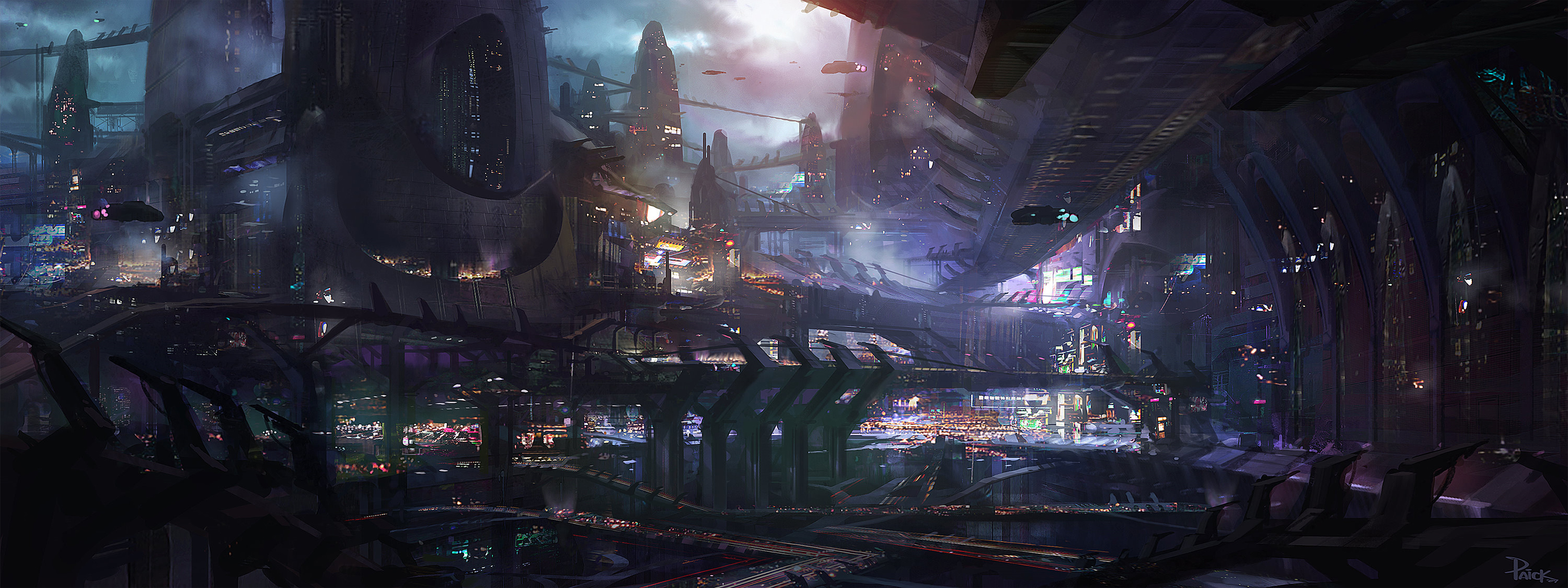 Description: A futuristic city with a lot of lights and buildings at night time.