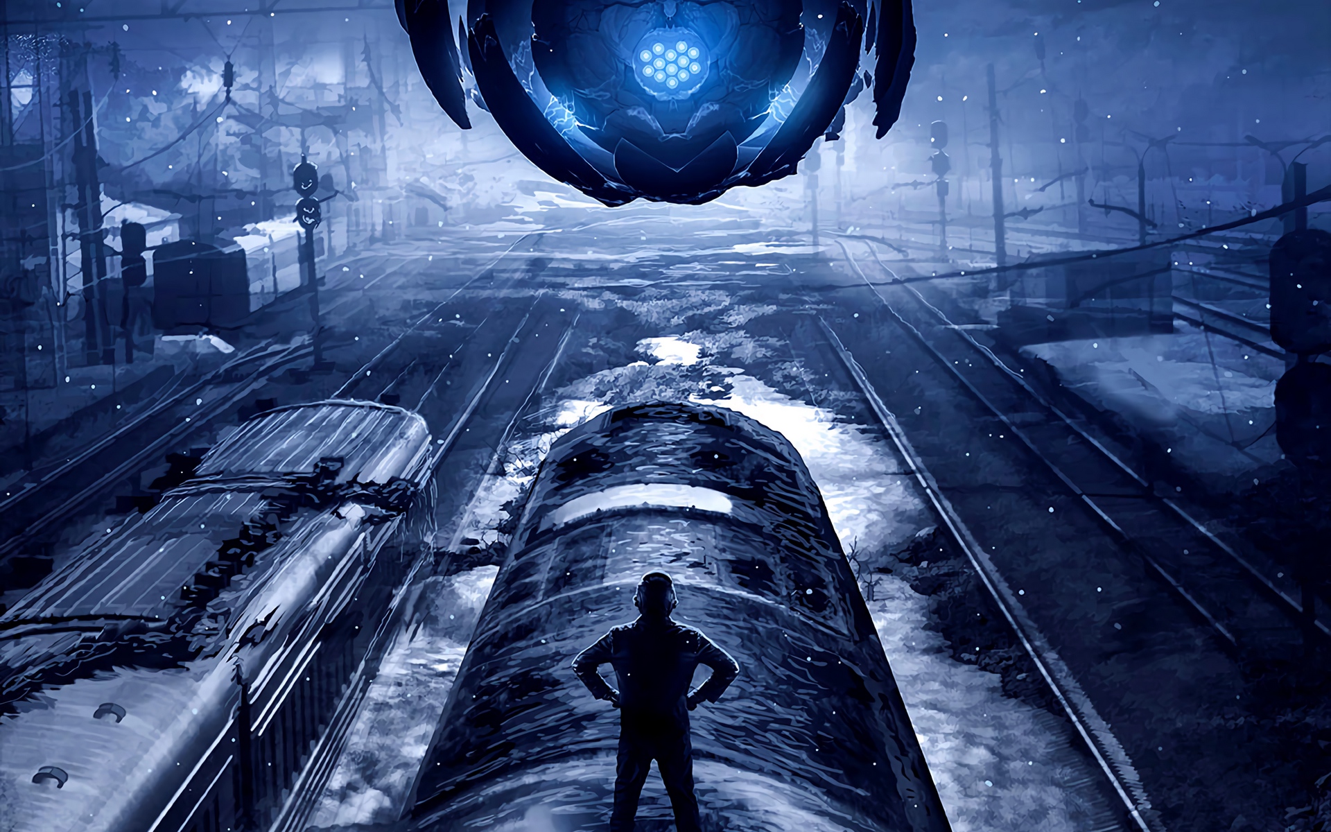 Description: A man standing in front of a train track in a futuristic city with a giant blue object above him.