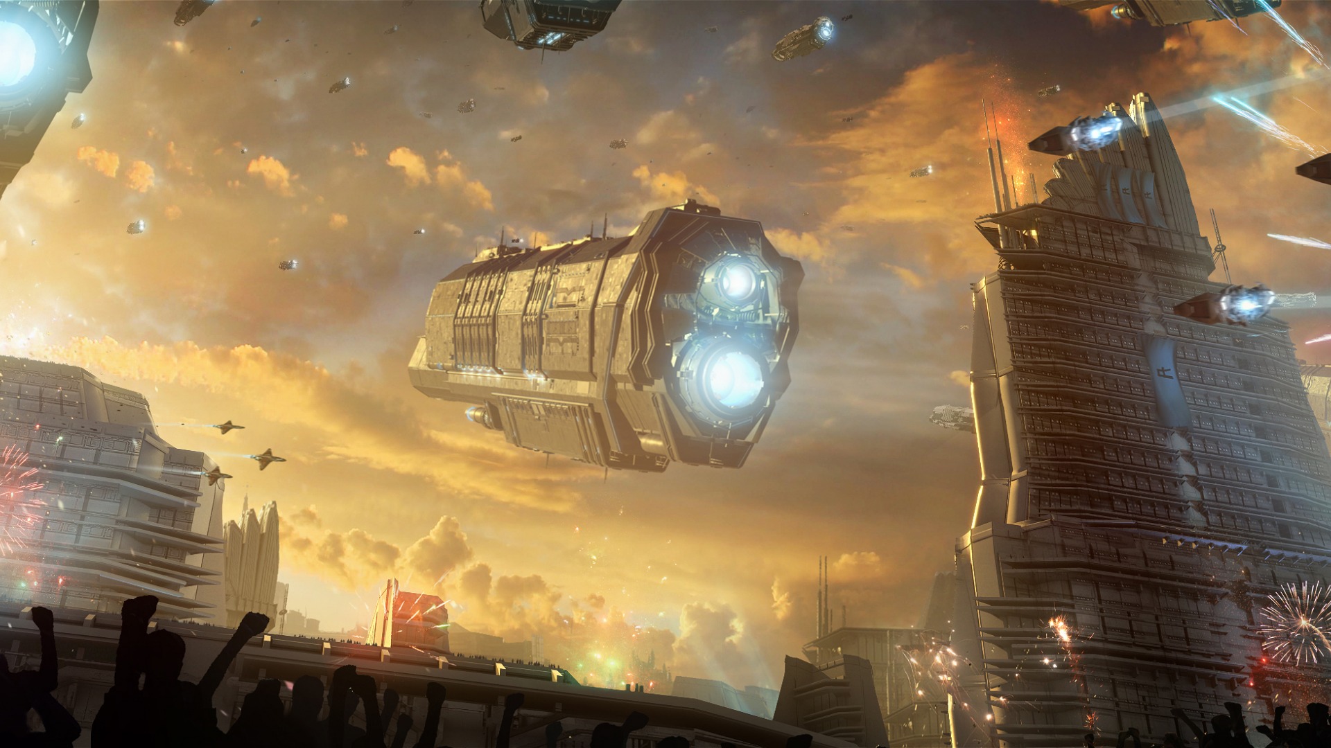 Description: A futuristic city with a huge spaceship flying over it's head and a lot of people standing around.