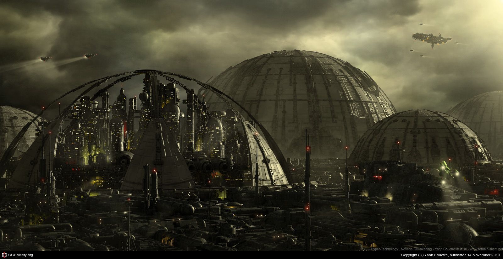 Description: A futuristic city with a futuristic looking structure and a helicopter flying over it in the sky above the city.
