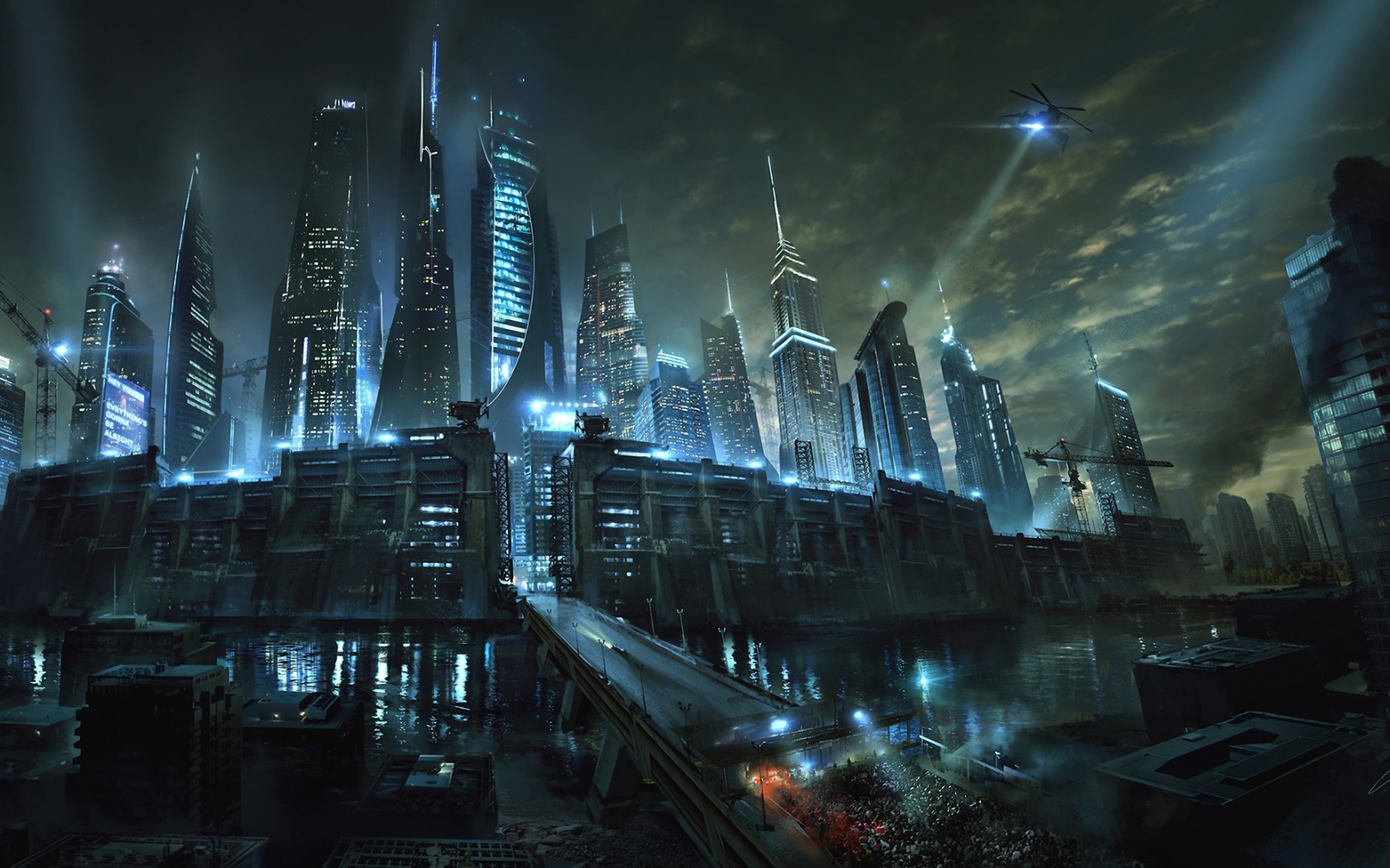 Description: A futuristic city with a train passing by at night time with lights on the buildings and a train passing by.