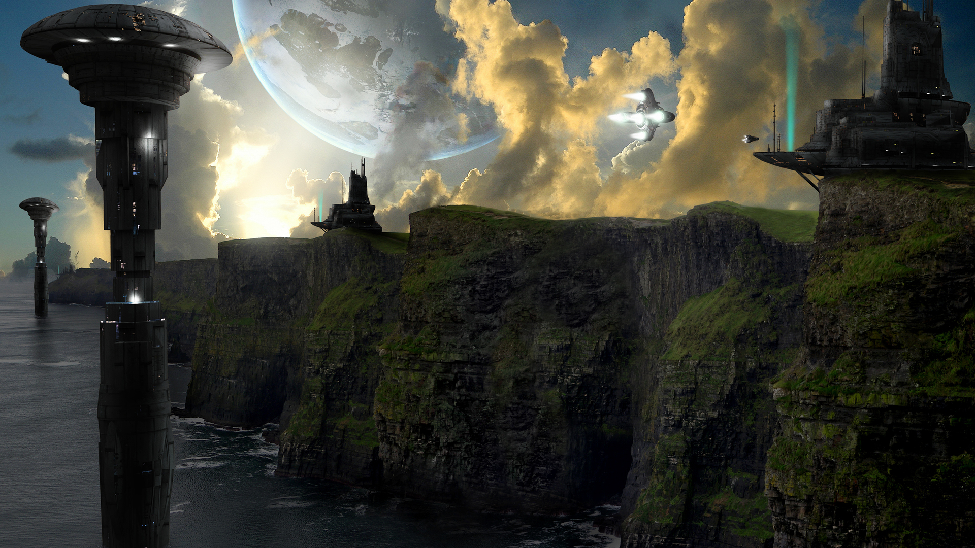 Description: A futuristic landscape with a giant cliff and a lighthouse on the cliff side with a giant moon in the sky.