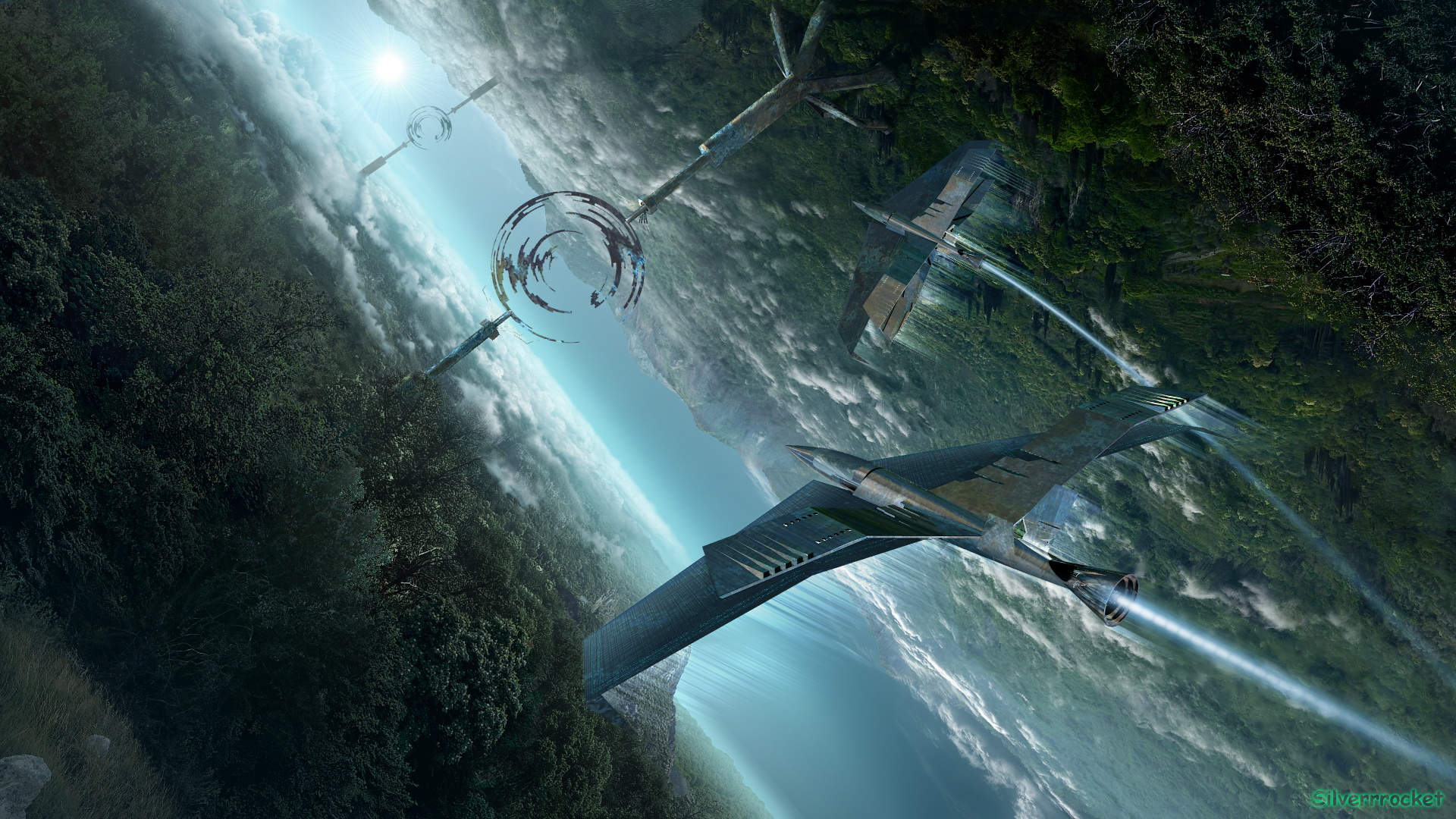 Description: A futuristic fighter jet flying through a forest filled sky with a sun in the background and a stream of water below.