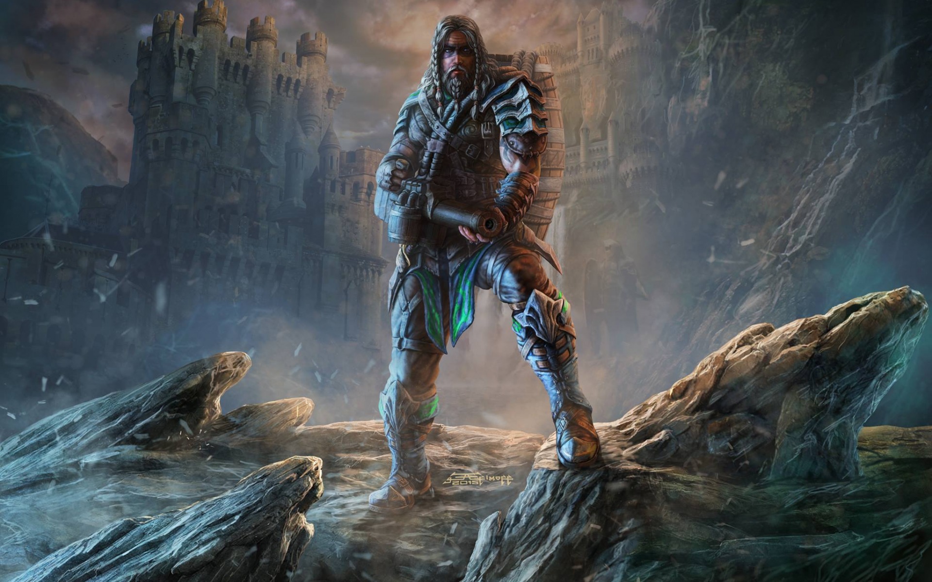Description: A man in a futuristic suit standing on a rock in a cave with a castle in the background and a sky filled with clouds.