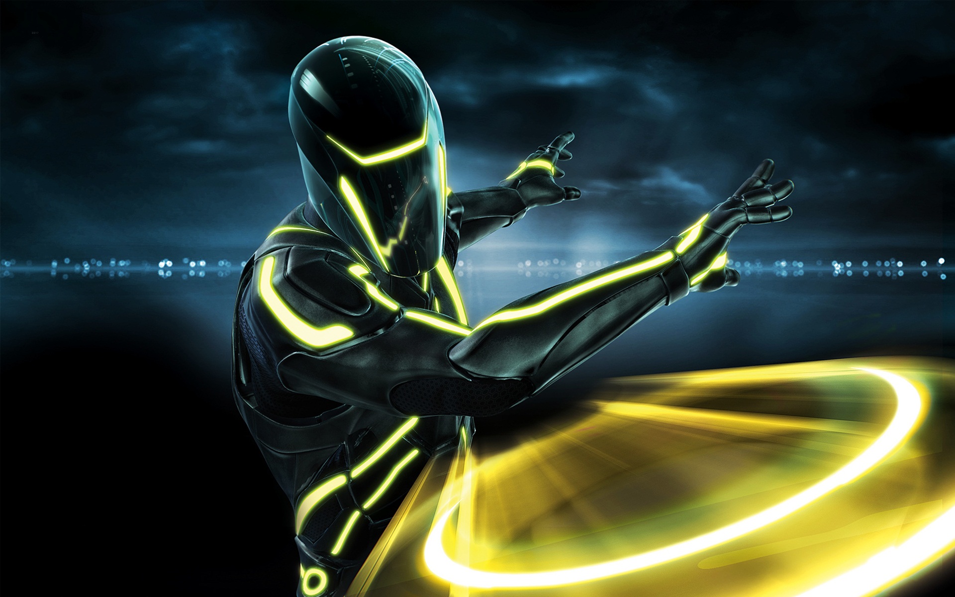 Description: A man in a futuristic suit is dancing with a light - up light - up motion on his body.