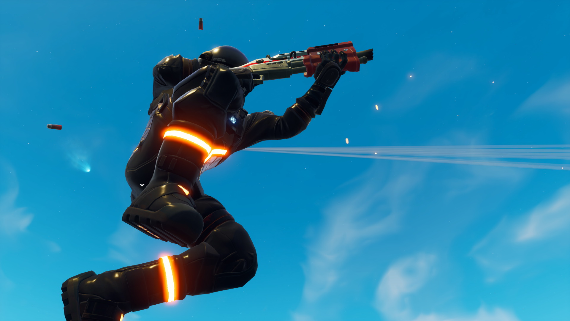 Description: A man in a futuristic suit holding a gun in the air with a jet streak in the background in a screenshot.