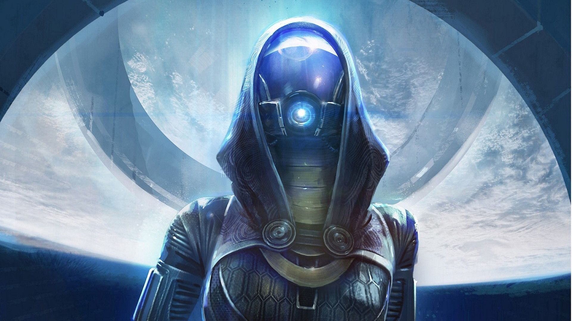 Description: A futuristic man in a space suit with a glowing eye and a helmet on his head.