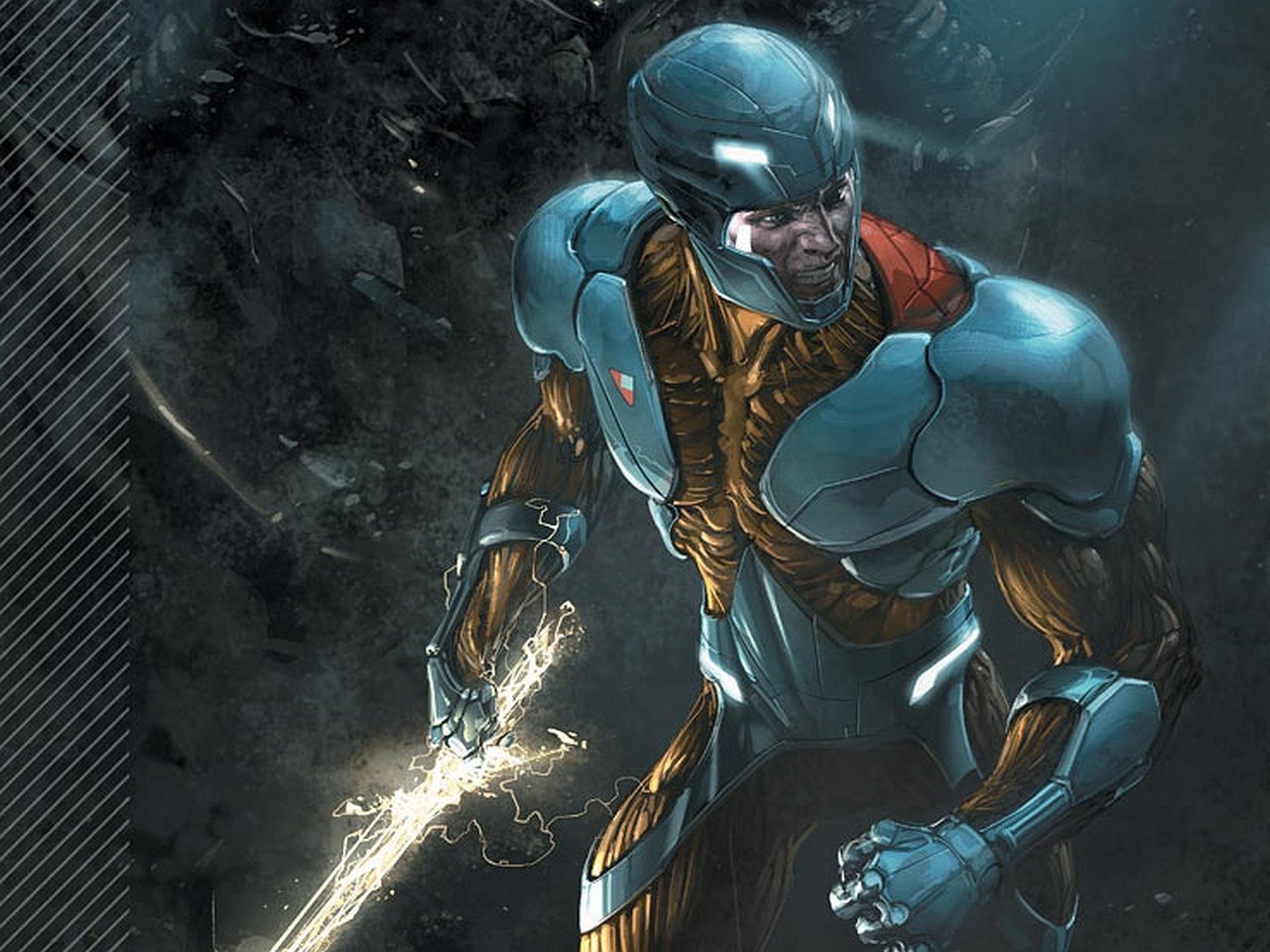 Description: A man in a futuristic suit holding a sword in his hand and a black background behind him is a black and white background.