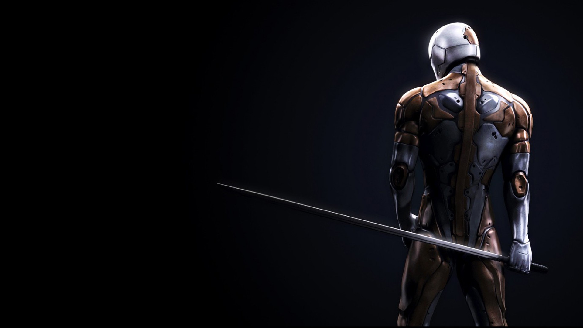 Description: A man in a futuristic suit holding a sword in his hand and looking at the camera with a black background.