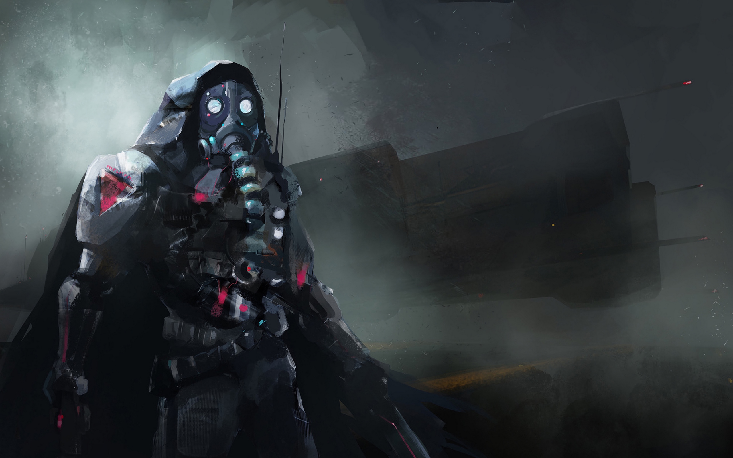 Description: A man in a futuristic suit holding a sword in a dark room with smoke and fog behind him.