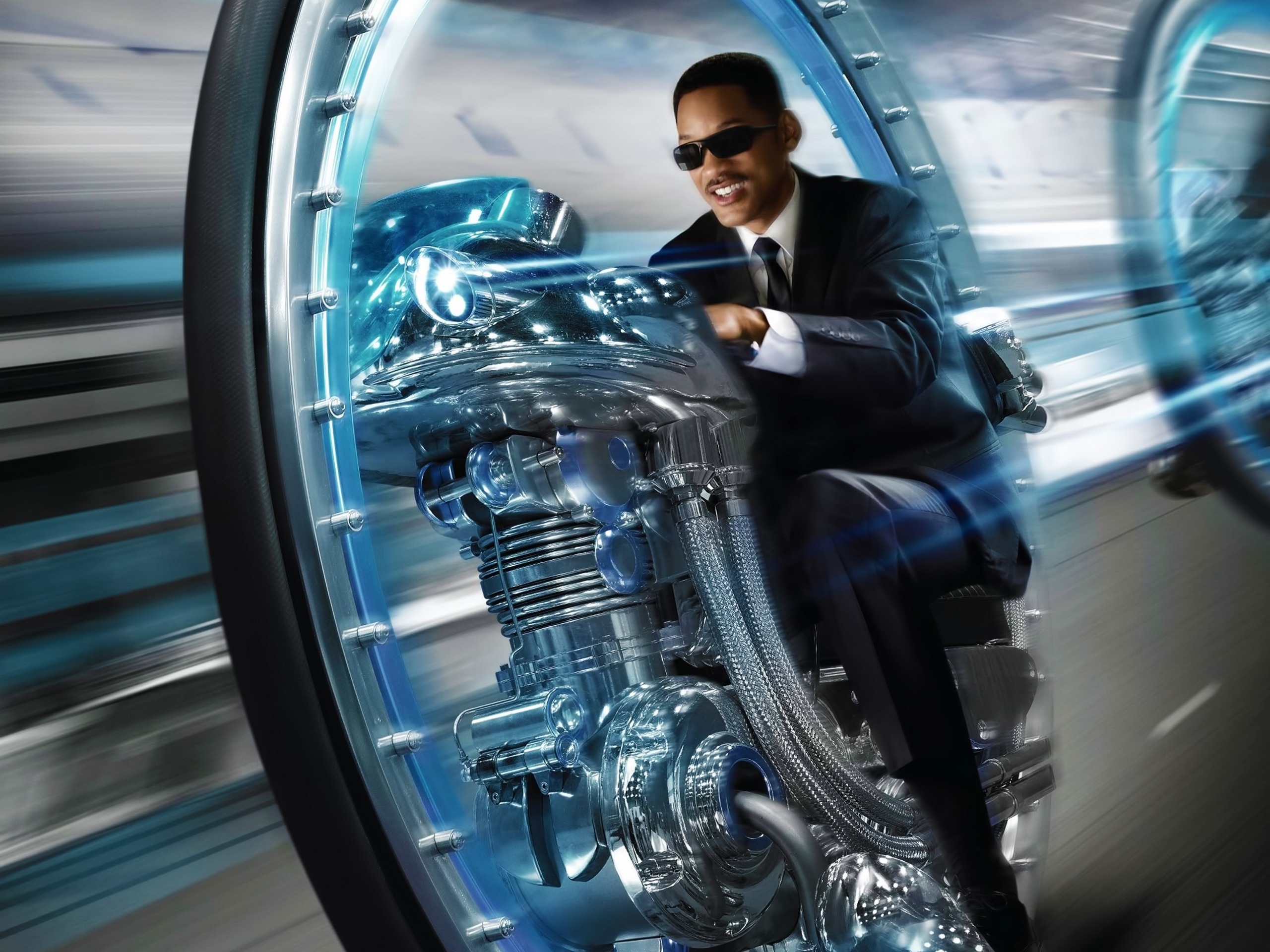 Description: A man in a suit and sunglasses riding a motorcycle in a tunnel of mirrors with a sky background and a blue light.