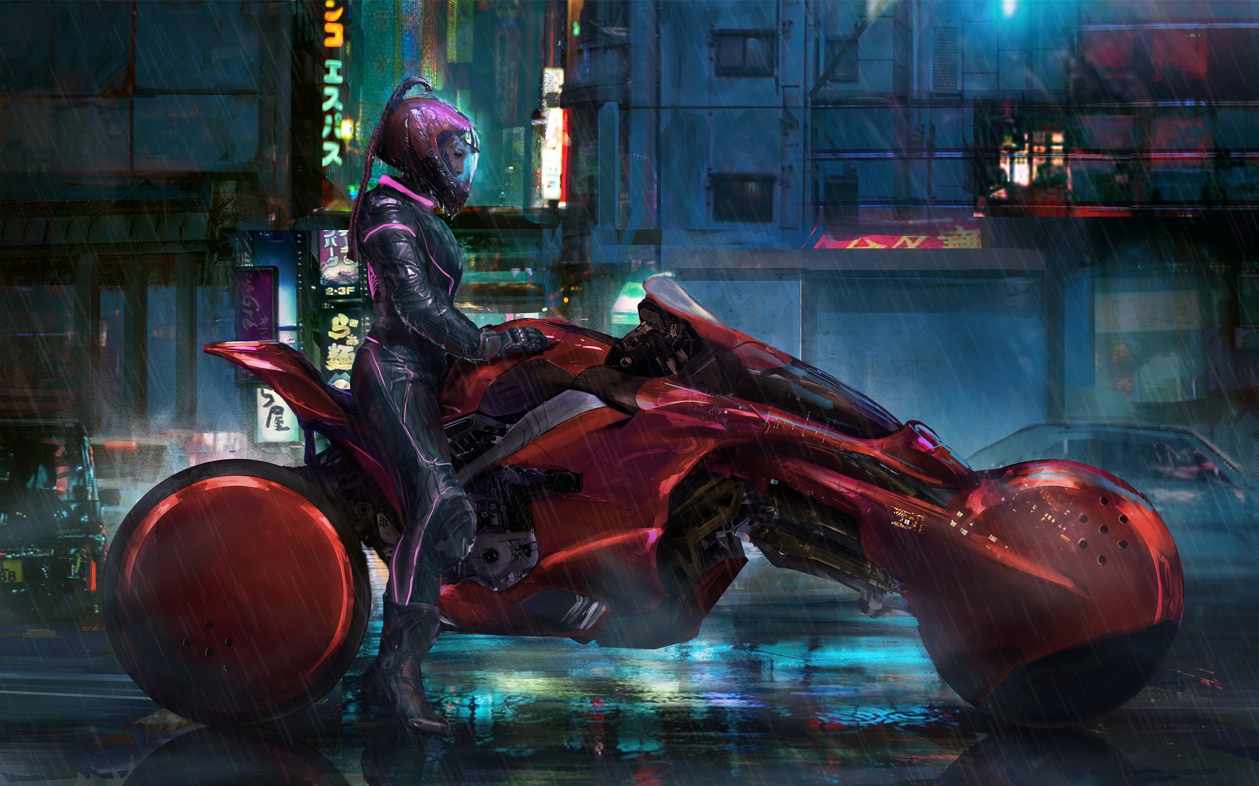 Description: A futuristic motorcycle with a person on it in the rain at night time.