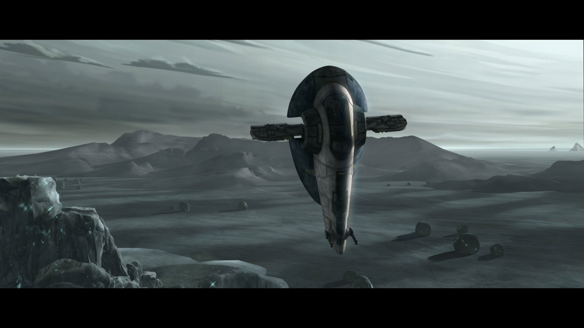 Description: A futuristic looking plane flying over a mountain range in a cloudy sky with mountains in the background and a few people sitting on the ground.