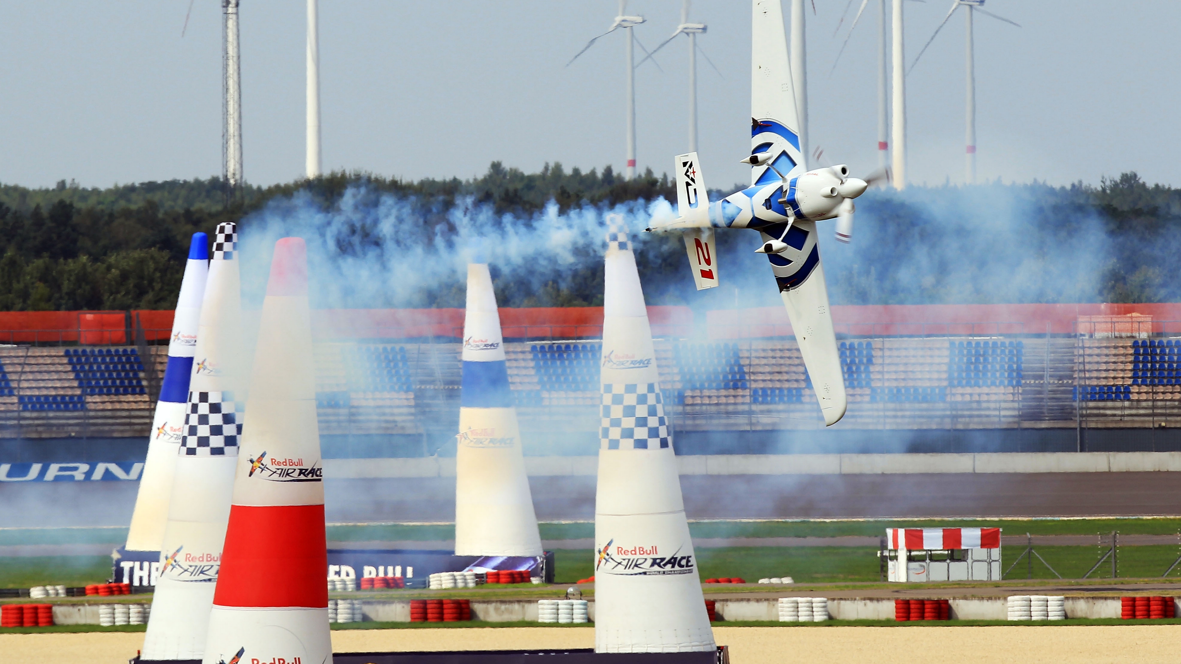 Description: A plane is flying over some cones on a track with smoke coming out of it and a person on the ground.