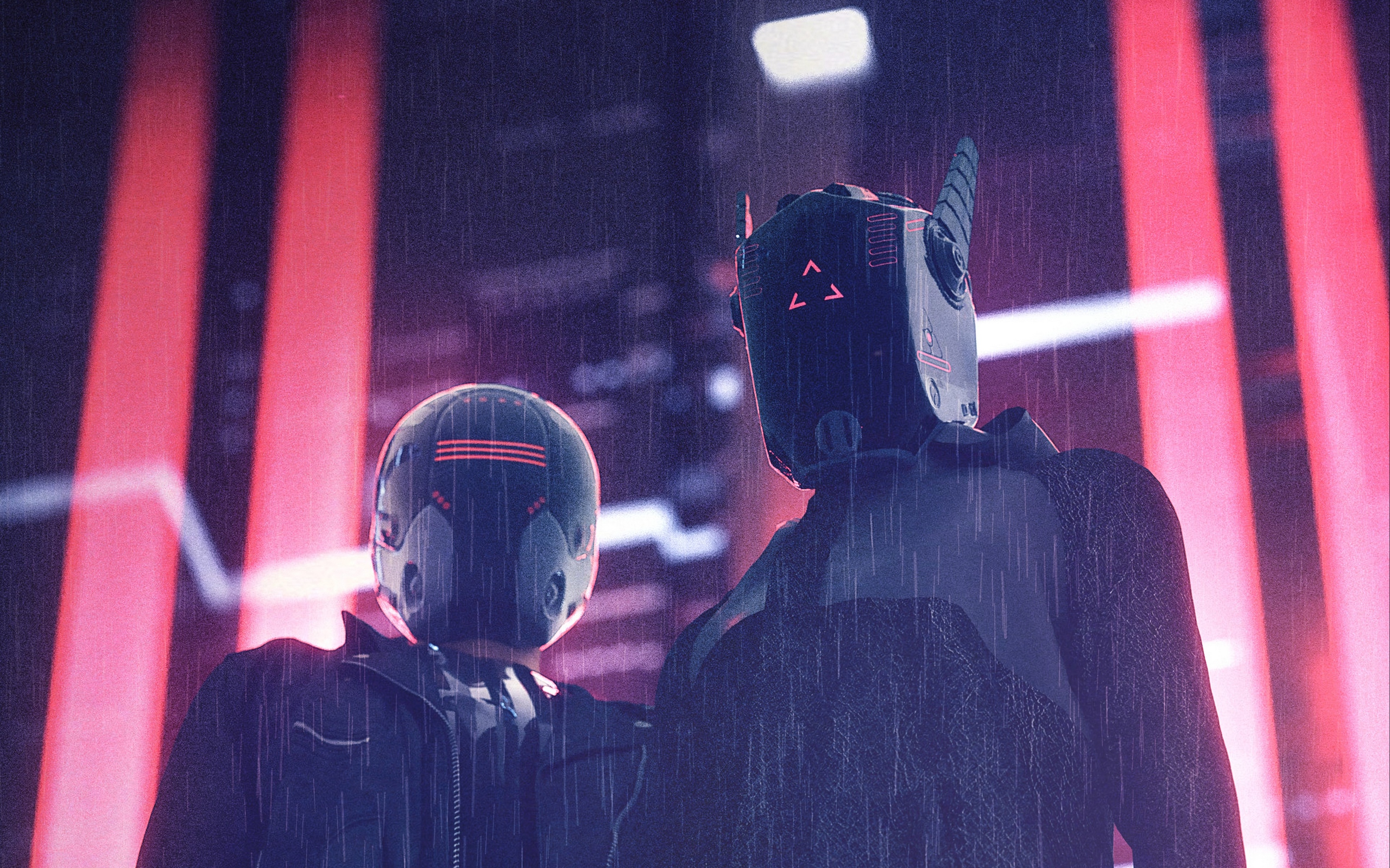 Description: Two people in costumes standing in the rain in a futuristic city at night with red beams behind them and a red light.