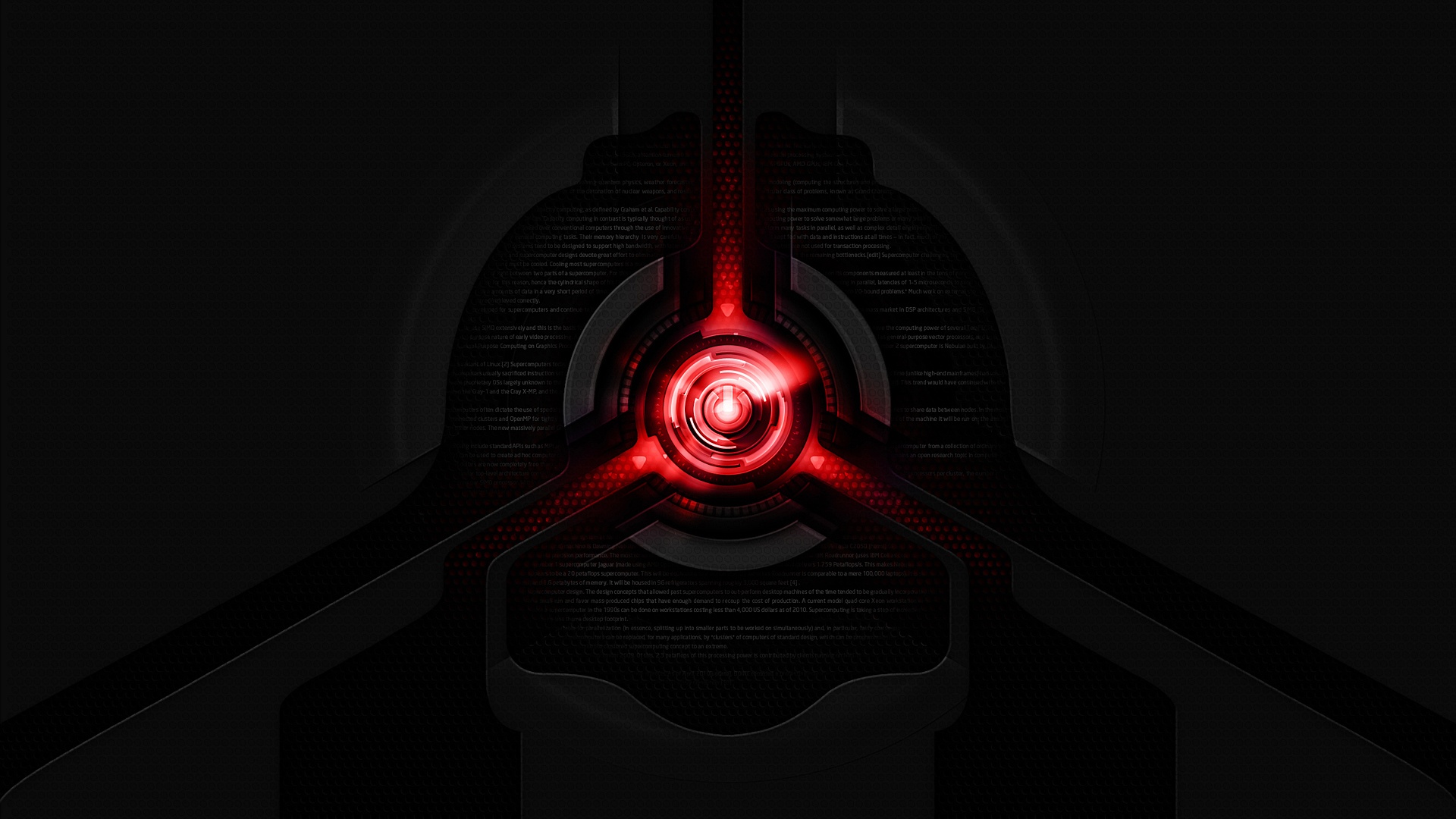 Description: A futuristic red light in the middle of a black background with a circular design on it's side.