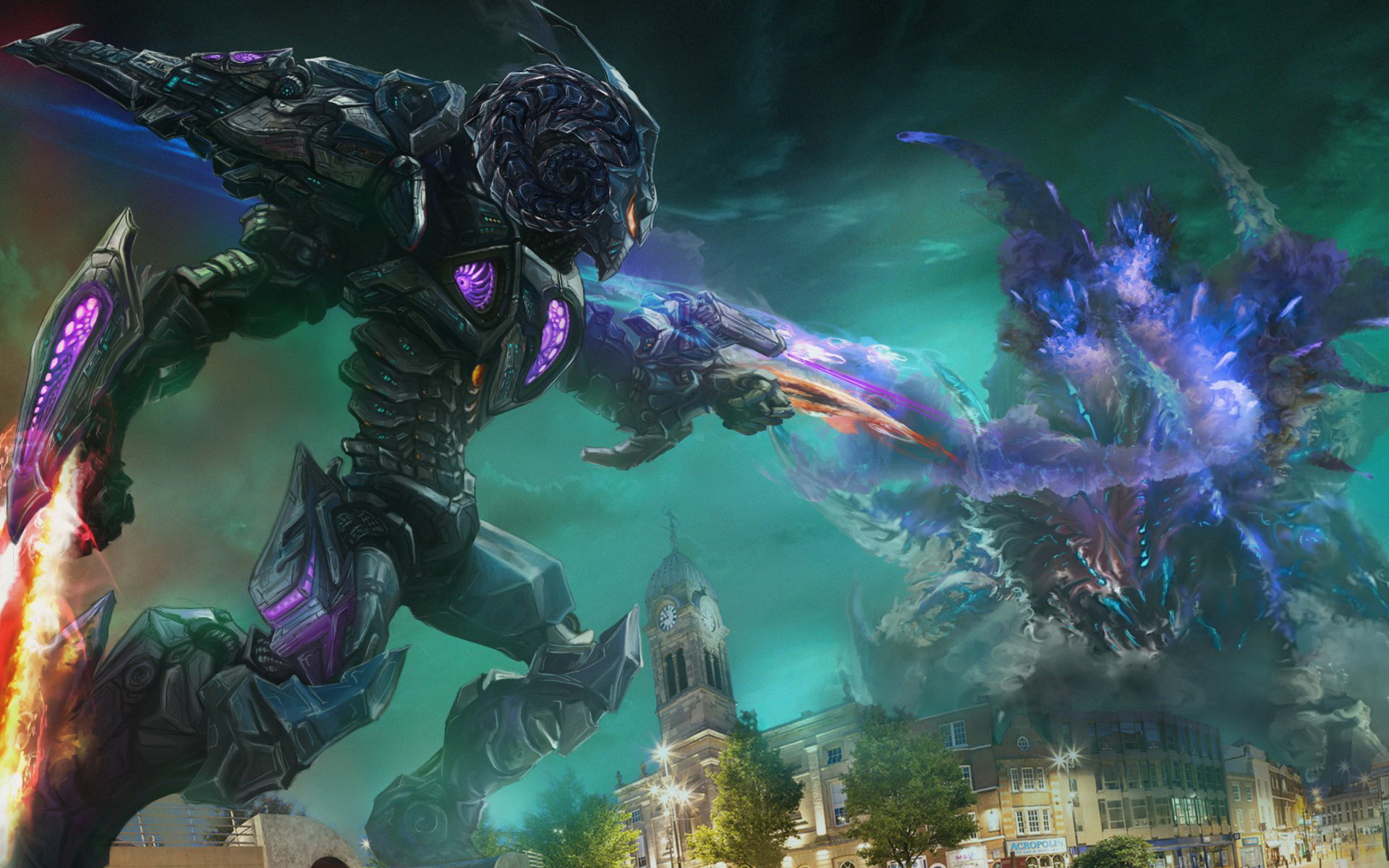 Description: A futuristic robot attacking a giant alien creature in a city at night with a huge fireball in the foreground.