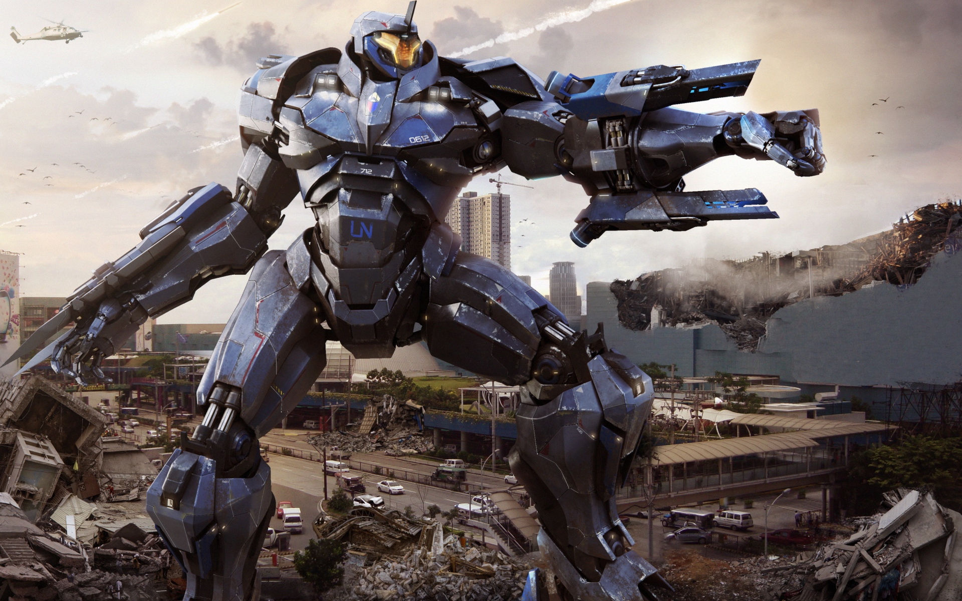 Description: A futuristic robot standing in a city with a jet in the background and a helicopter flying overhead in the sky.