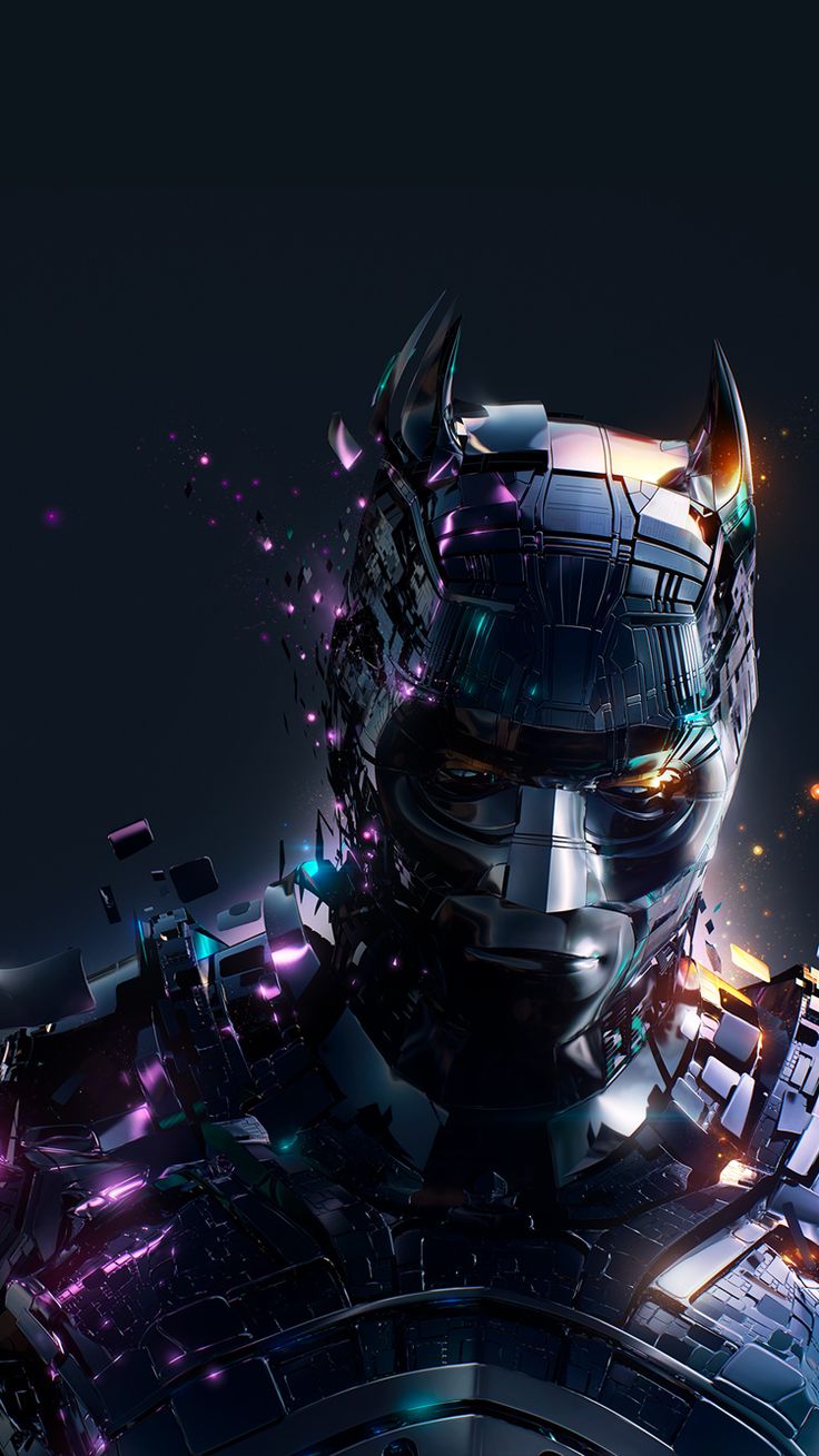 Description: A futuristic robot with a glowing face and a futuristic background with a black background and a purple and green light.