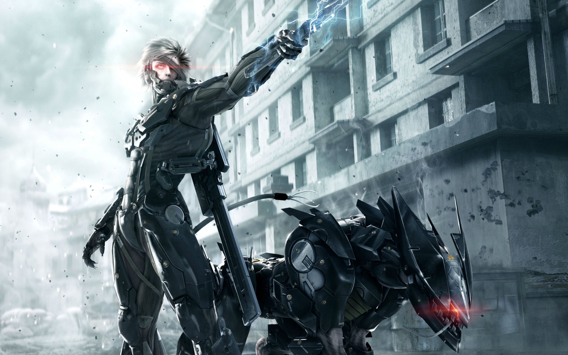 Description: A person in a futuristic suit holding a gun and pointing at something in the air with a building in the background.