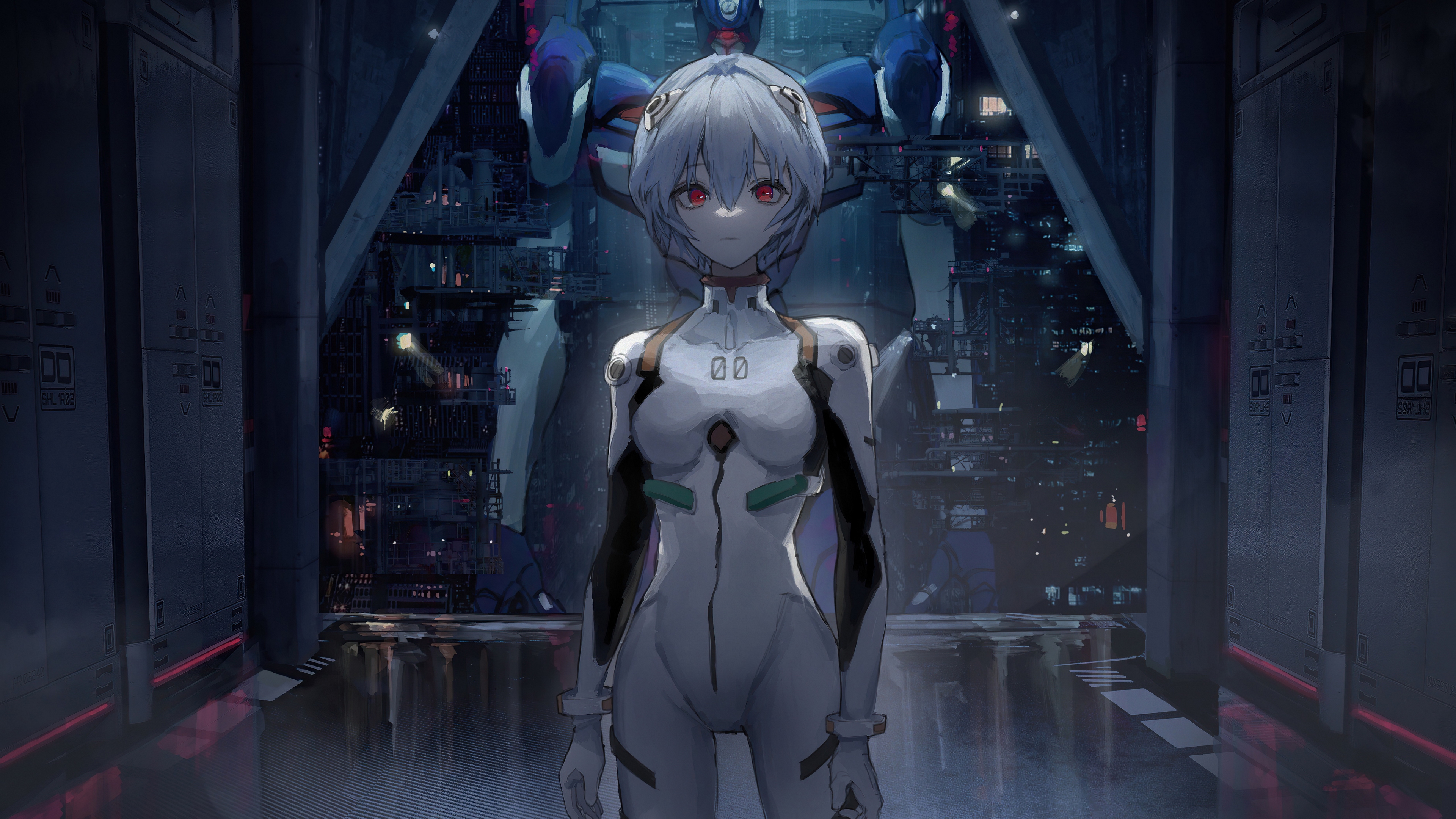 Description: A woman in a futuristic suit standing in a hallway with a city in the background at night time with red eyes.