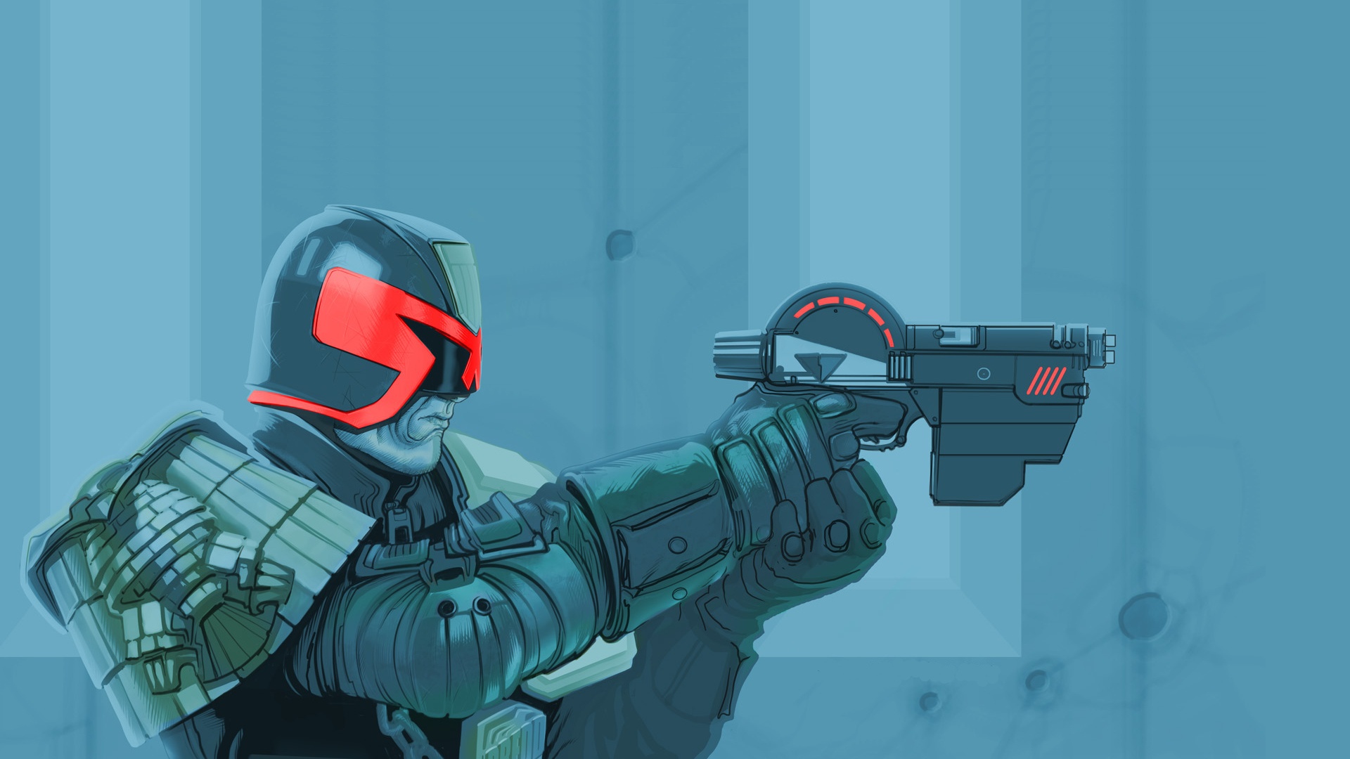 Description: A man in a futuristic suit holding a gun and aiming it at something with a red light on his face.