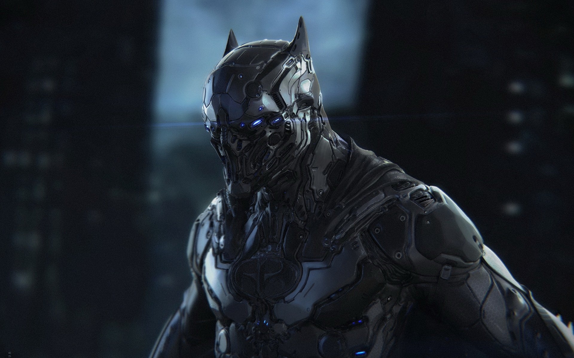Description: A man in a futuristic suit with a bat on his face and a city in the background with buildings.