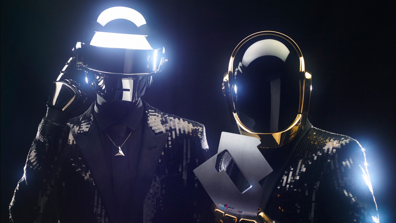 Description: Two men in futuristic suits and helmets standing in the dark with their hands on their hipss and their faces glowing.