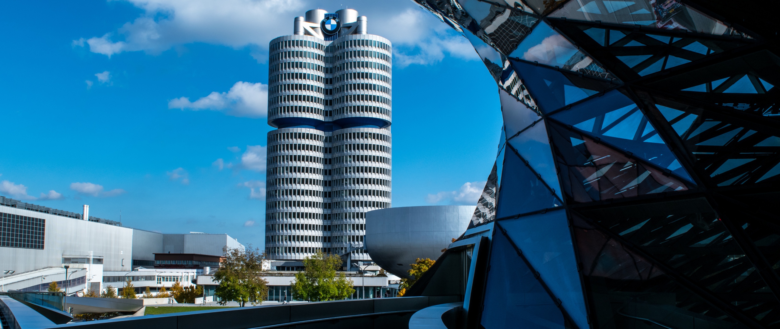 Description: A tall building with a blue and white design on it's side and a sky background with clouds.