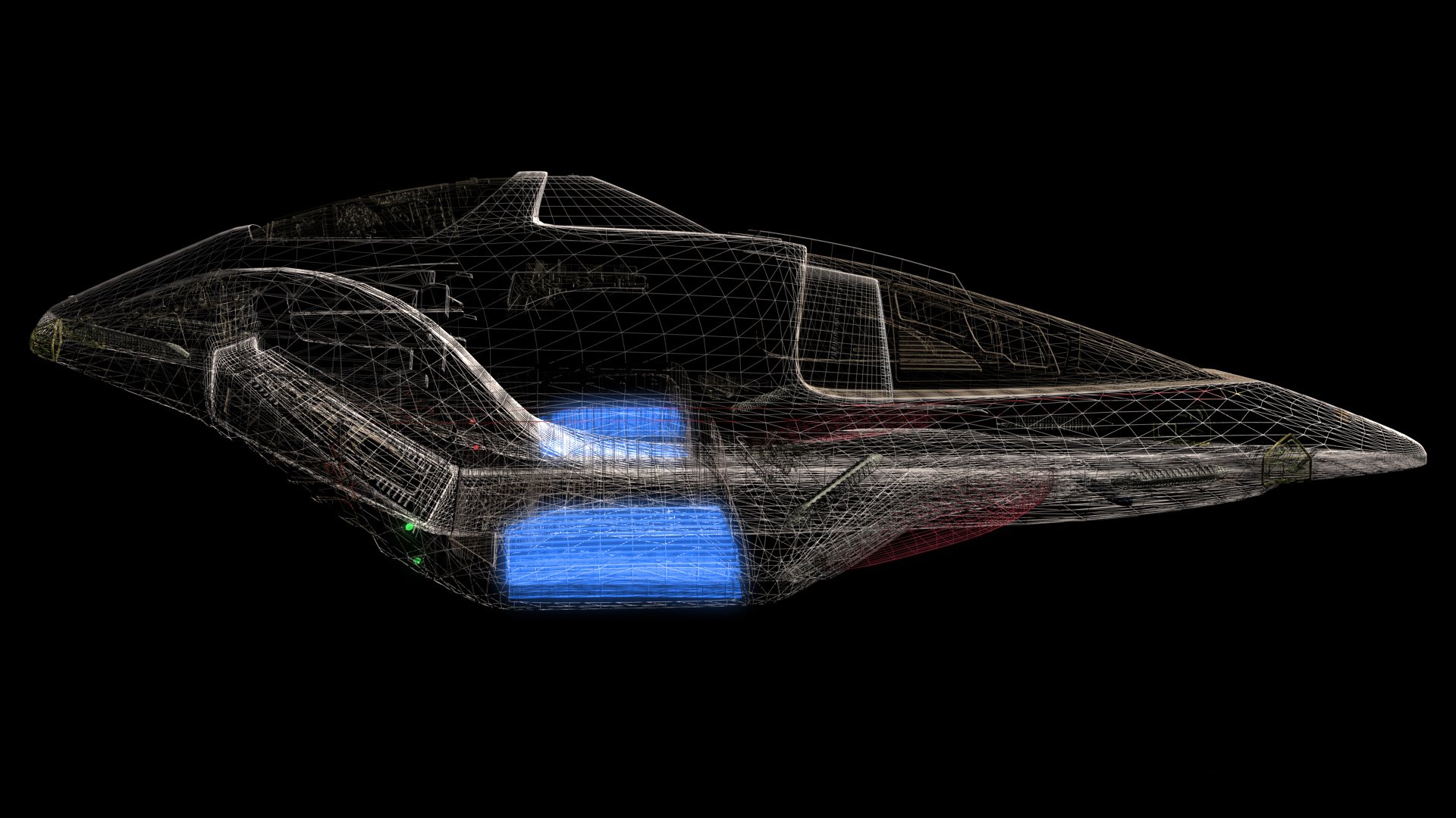 Description: A computer generated image of a futuristic vehicle with a blue stripe on the side of the vehicle and a black background.