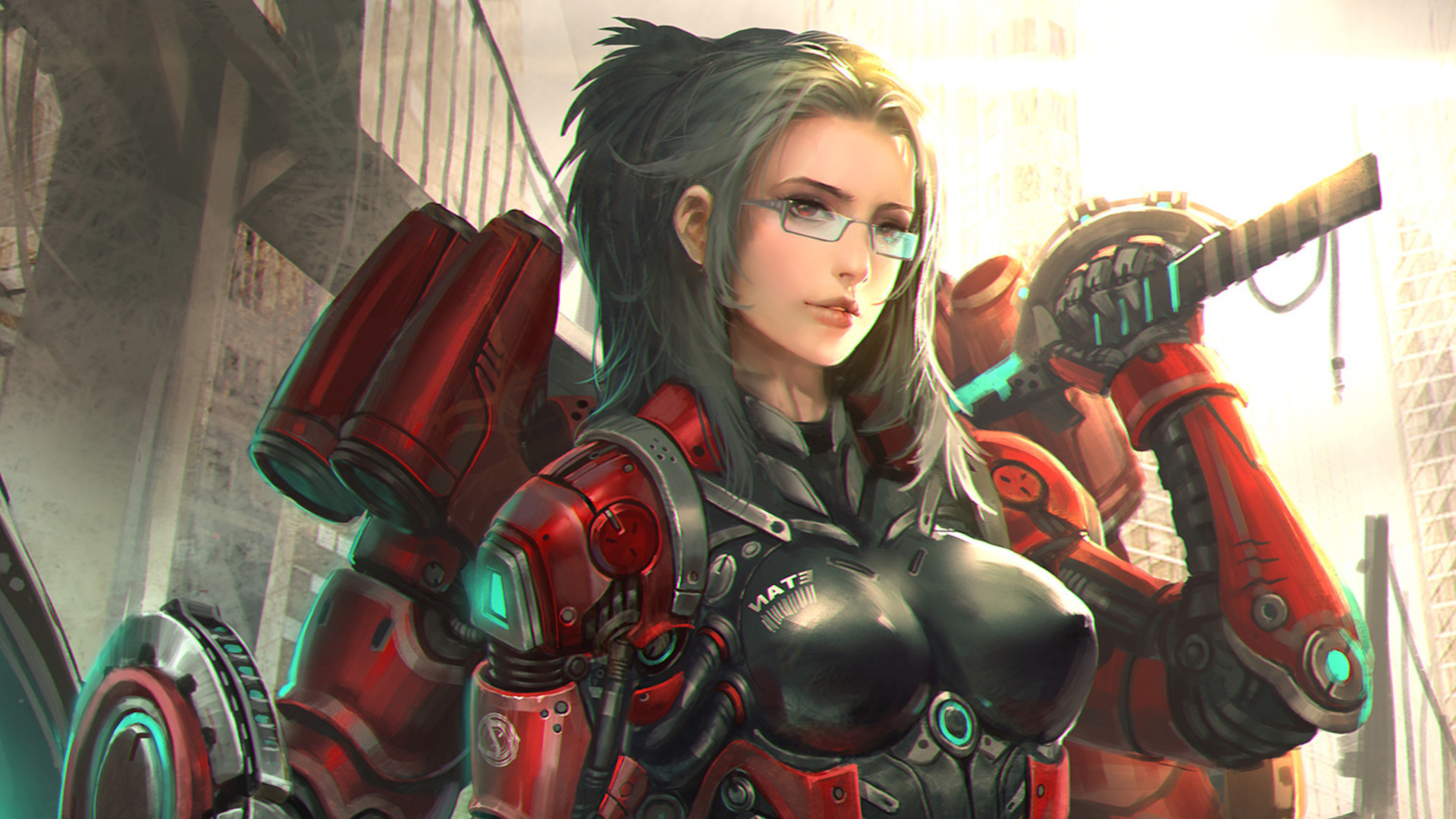 Description: A woman in a futuristic suit holding a gun and a gun in her hand.