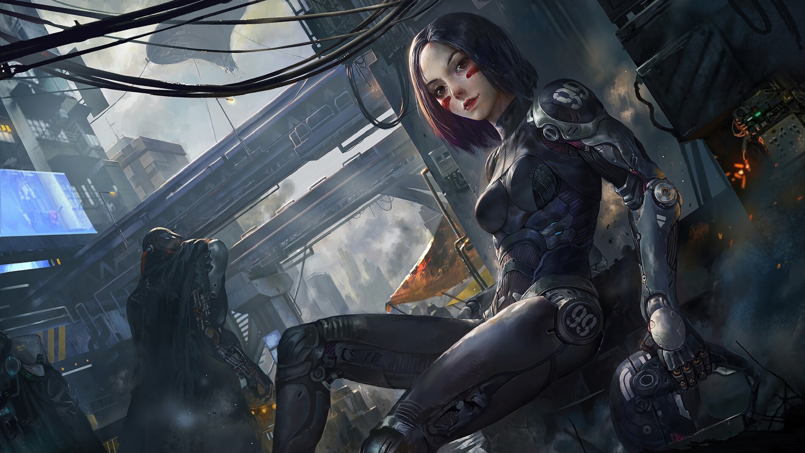Description: A woman in a futuristic suit sitting on a chair in a room with a monitor screen and a robot.